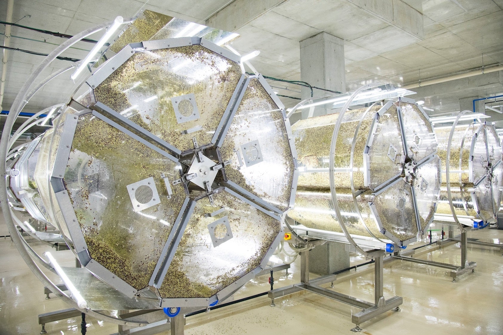 コンピュータ制御された円筒形の栽培装置はゆっくりと回転し、スプラウトに光と水と空気をまんべんなく与えます。