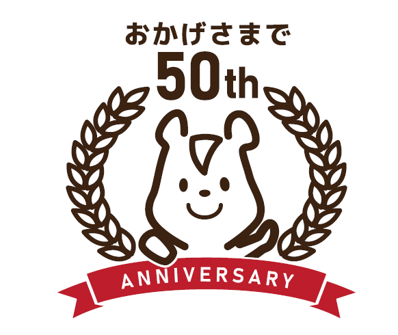 ロゴには当社のオリジナルキャラクターでもあるファイン君をモチーフに、50周年を迎えられた喜びを表現しました。キャラクターを囲む月桂樹は葉が落ちず枯れないことから縁起の良い木として親しまれています。お客様とともに次の5年、10年、50年先も共に歩み続けたいという思いから、デザインしました。