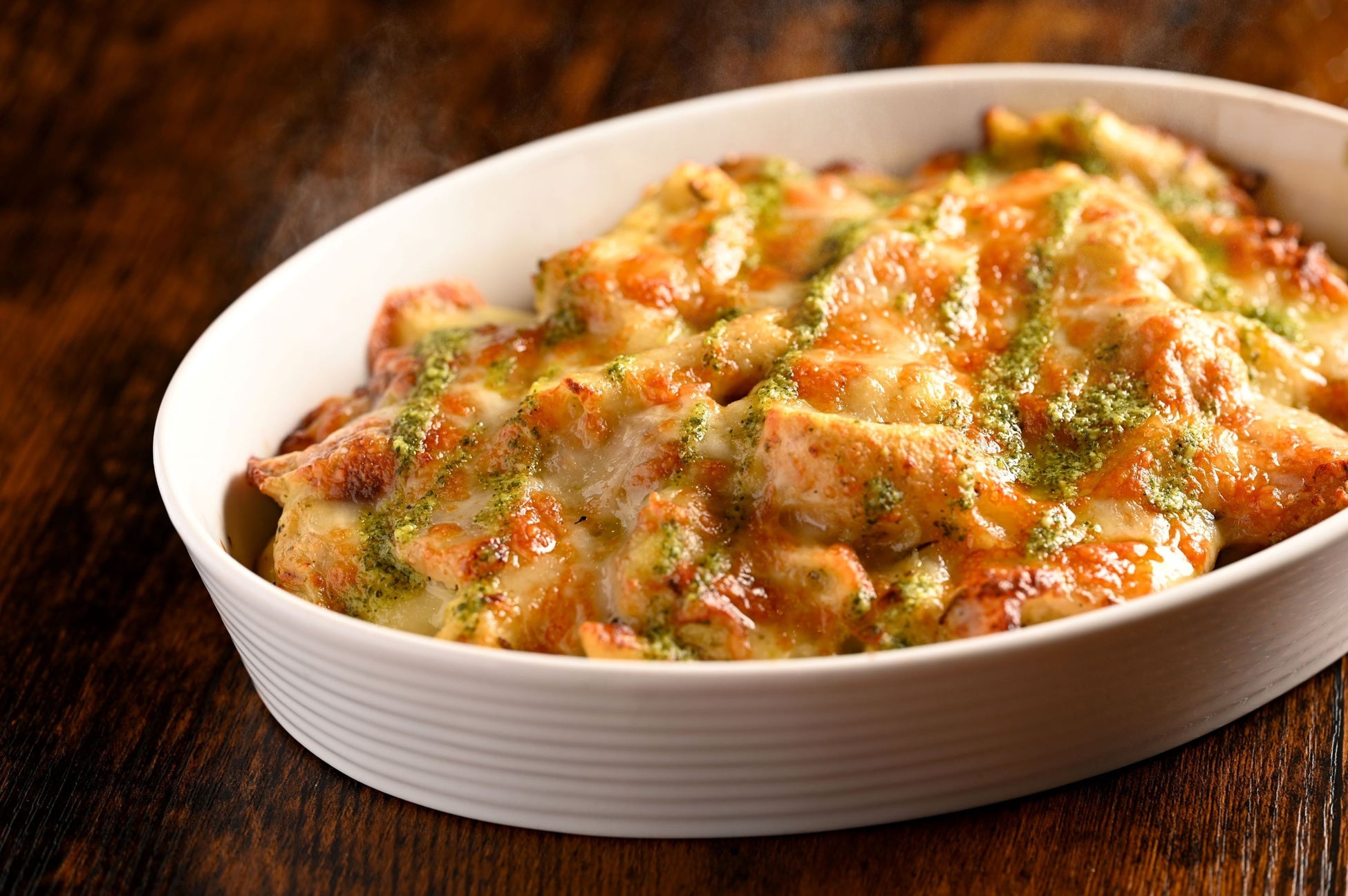 豚肉を使用した、食べごたえのあるマカロニグラタン。ジェノベーゼソースで香り良く仕上げています。通常のホワイトソースグラタンとは一味違う、見た目・香り・味をお楽しみいただけます。
