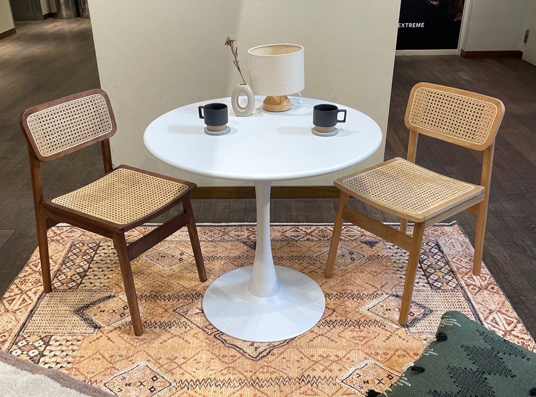 天然木や自然素材のチェアには、木製のテーブルがぴったり、ということはもちろんですが、スチールのような異素材のテーブルでもしっくりコーディネートできます。テーブルライトは自然素材をつかったものを置いたり、インテリアグリーンや花を飾ったりして、「自然素材」のつながりを感じられるアイテムをコーディネートするとまとまりを出すことができます。 様々な素材の家具とのコーディネートに対応できるのは、やはりこのチェアの持つ雰囲気や高級感=インテリア力が高いからでしょう。