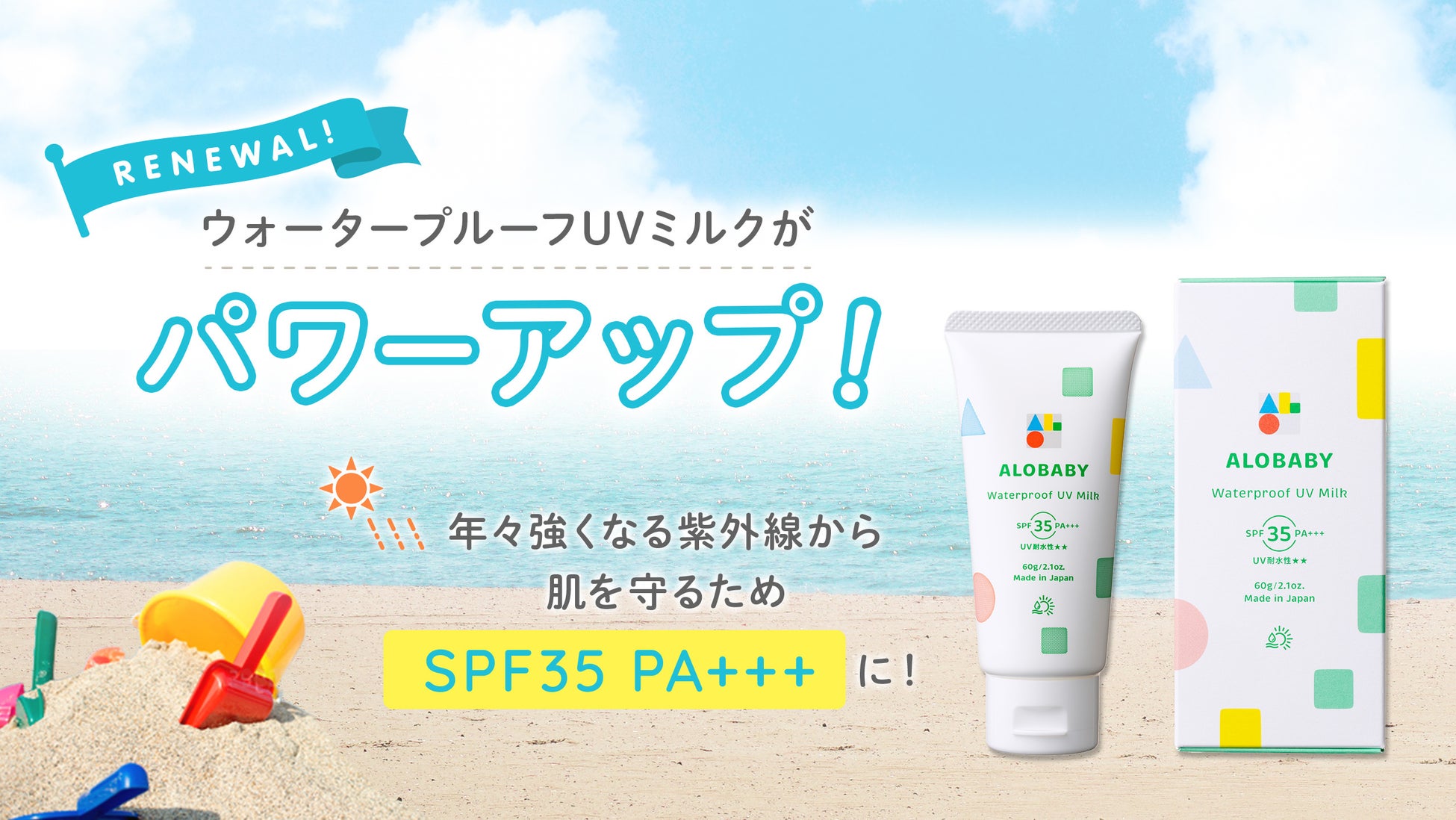 春夏の水遊びに!汗・水に強く肌にやさしい日焼け止め アロベビー ウォータープルーフ UV ミルク 3月5日(火)発売