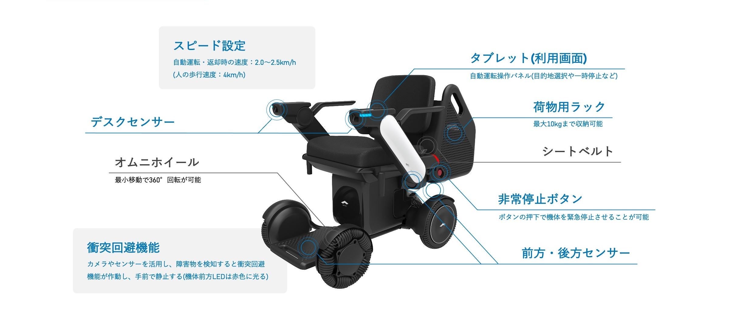 WHILL社が開発する、デザイン性と走破性に優れたパーソナルモビリティに自動運転・自動停止機能などを搭載した「WHILL自動運転モデル」と、複数の機体を管理・運用するシステムから構成される、歩道・室内領域のための自動運転システム。あらかじめ収集した地図情報と、センサー群で検知した周囲の状況を照らし合わせ、自動走行および自動運転による無人での返却が可能。