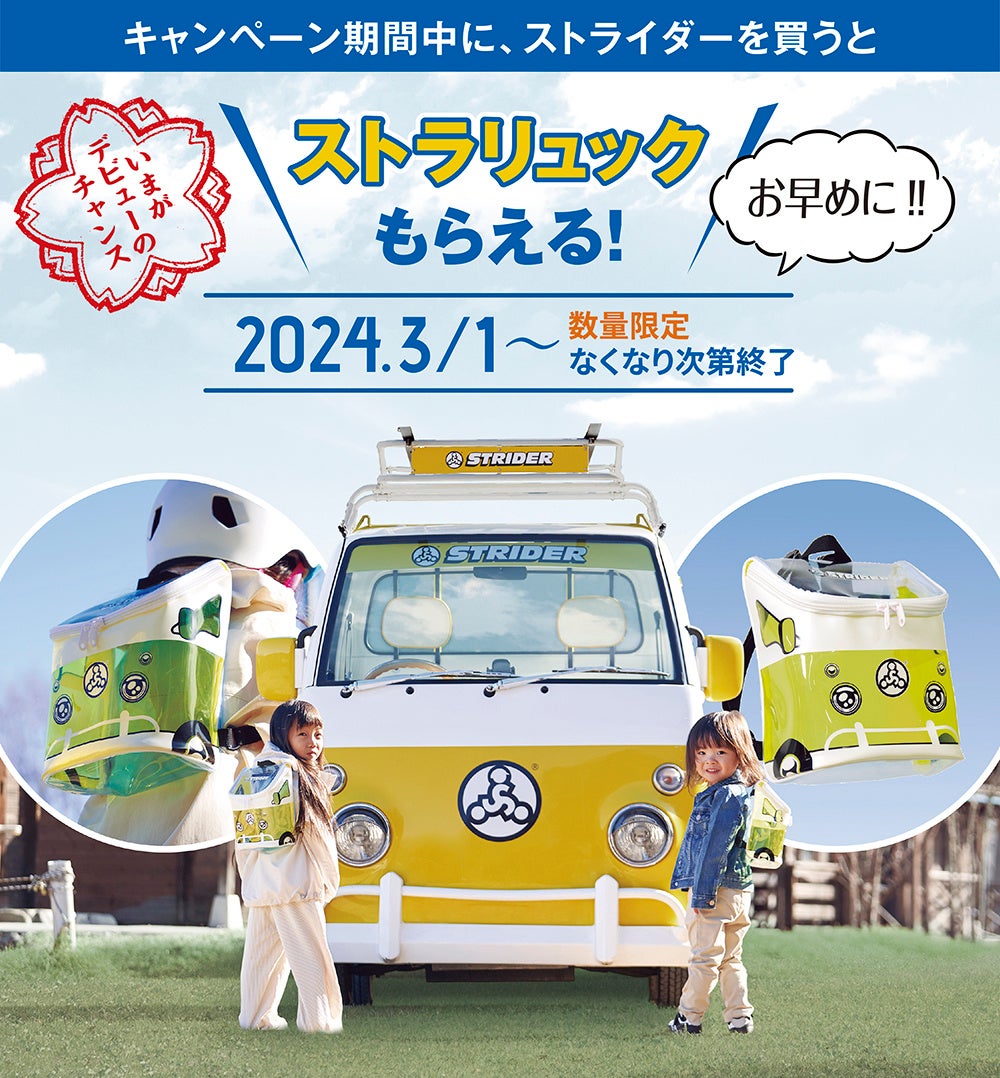 【2024年3月1日(金)よりストライダー春のキャンペーンがスタート!】キャンペーン期間中にストライダーを購入するとストラリュックもらえる!