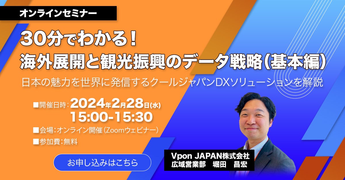 日本の魅力をデータ&デジタルの力で世界へ届けるVpon JAPAN株式会社(本社:東京都新宿区、代表取締役社長:篠原 好孝、以下Vpon JAPAN)は、2024年2月28日(水)に『30分でわかる!海外展開と観光振興のデータ戦略(基本編)』と題したオンラインセミナーを開催することをお知らせいたします。