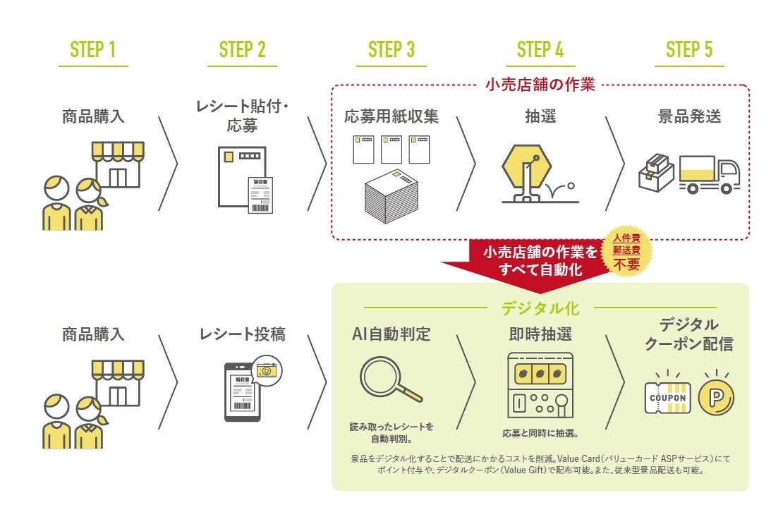 以前から、バリューデザインのサービスを導入中の小売店の皆様より、「レシート販促はもっと実施したいが、メーカーによって異なる販促施策に対応することが大変。また実行には人件費や郵送費がかかることも課題」などの声をいただいていました。