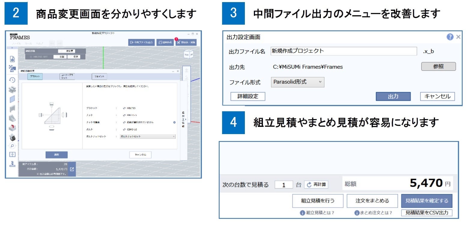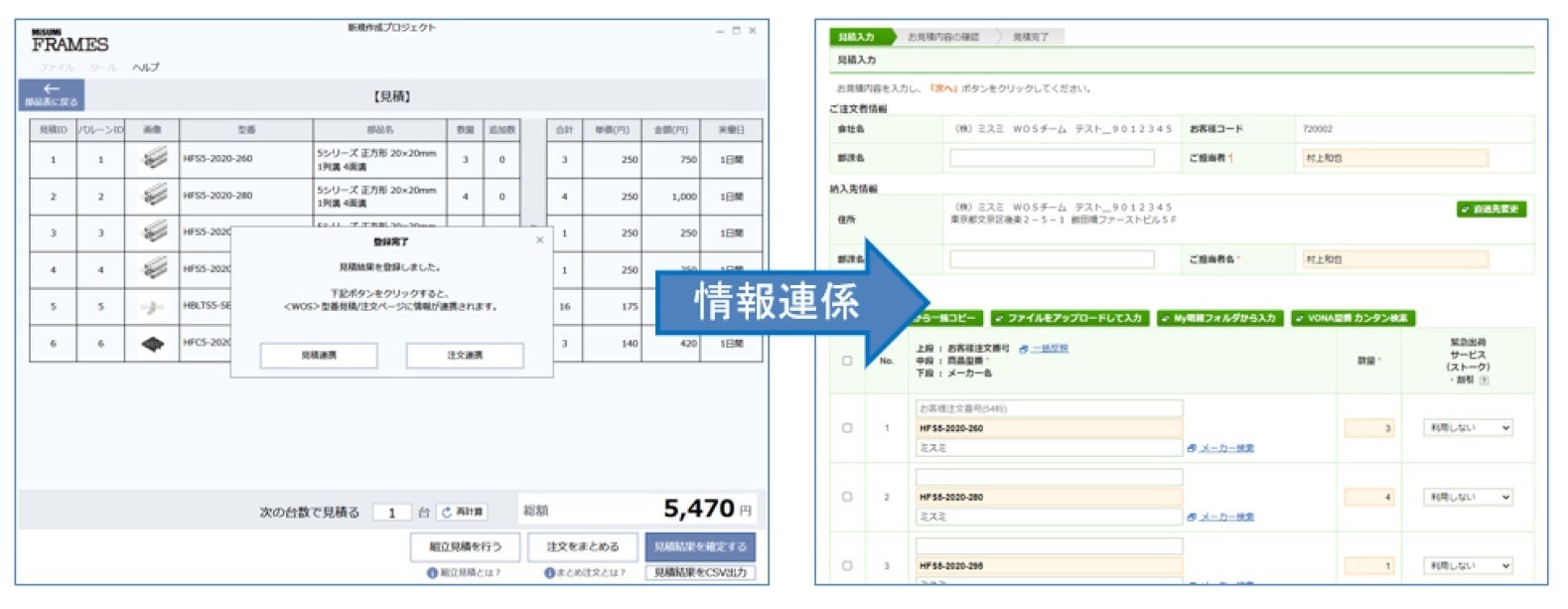 これまではFRAMES上で設計した部品表をWOS注文画面に連係することが可能でしたが、お客さまの要望にお応えしWOS見積画面にも連係することが可能となりました。WOSを用いたお客さま社内での購買連係がよりシームレスになりました。 ※2 Web Order System