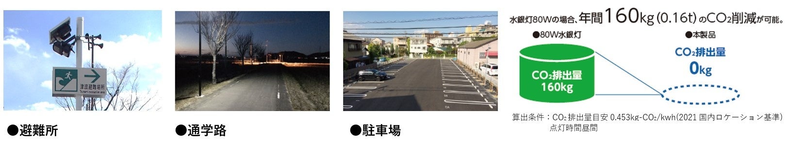 特に電源が取れない通学路や駐車場などに最適です。また屋外照明は未だLED化されていない箇所も多く存在しており、LC-2000LUへの切り替えで効率的に使用時のCO2排出を削減いただけます。