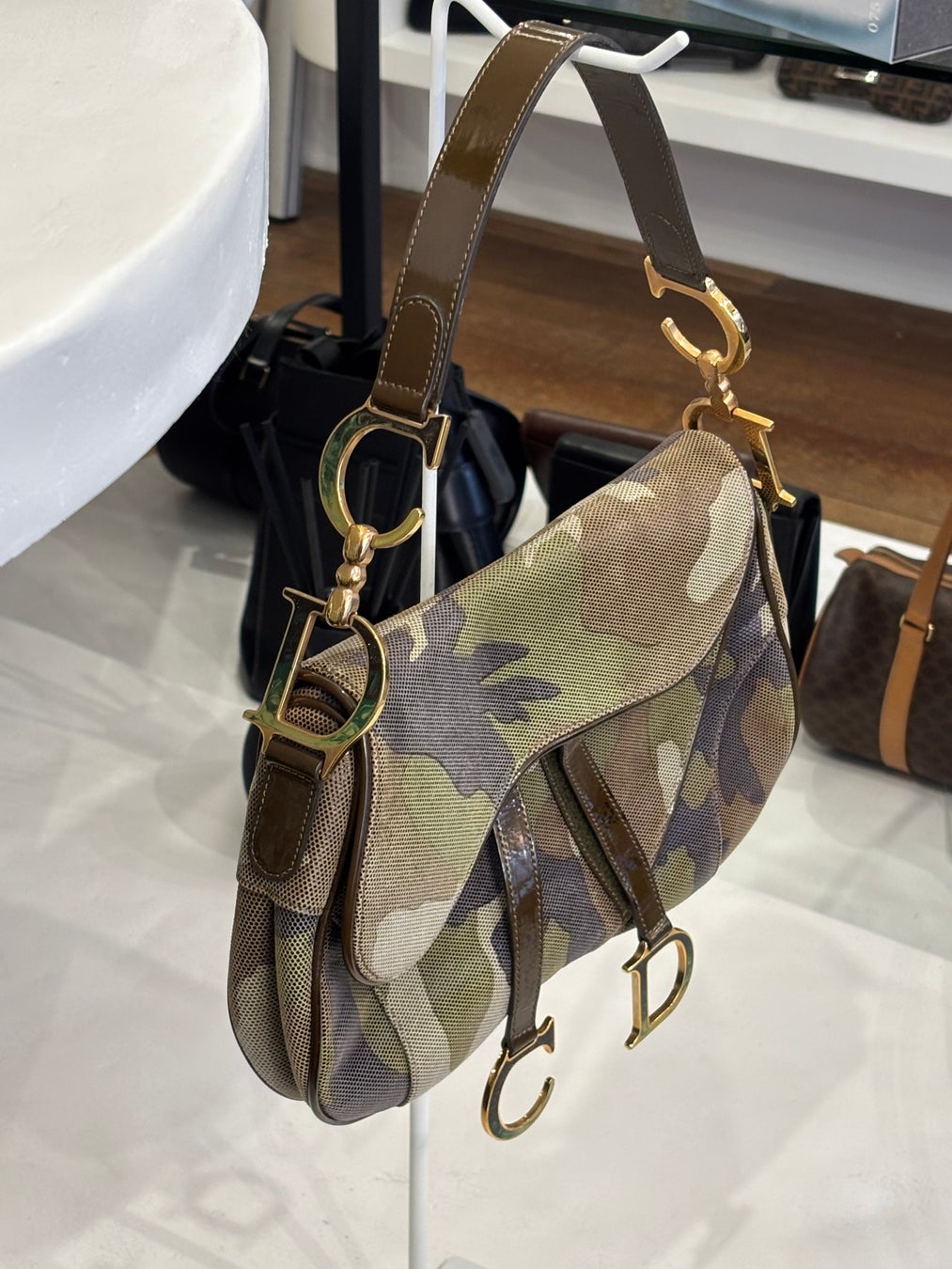 カモフラージュプリントをメッシュで表現した個性的なデザイン。透け感のある素材使いとゴールドのロゴが印象的な、ガリアーノ期らしい遊び心あふれるバッグです。ディオールを象徴する「サドルバッグ」に、ミリタリー要素を取り入れた当時特有のエッジの効いたムードが溢れています。