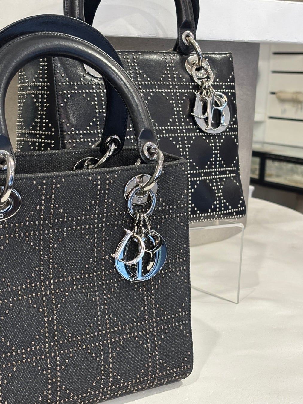 ブランドを象徴する「レディディオール」を、通常のステッチではなくスタッズで表現した希少モデル。スタッズで描かれたカナージュ、シルバー金具、重みのあるレザー、エッジの効いた装飾。重厚感のあるレザーとエッジの効いたデザインが特徴で、生産数も限られていたとされる貴重な一品です。