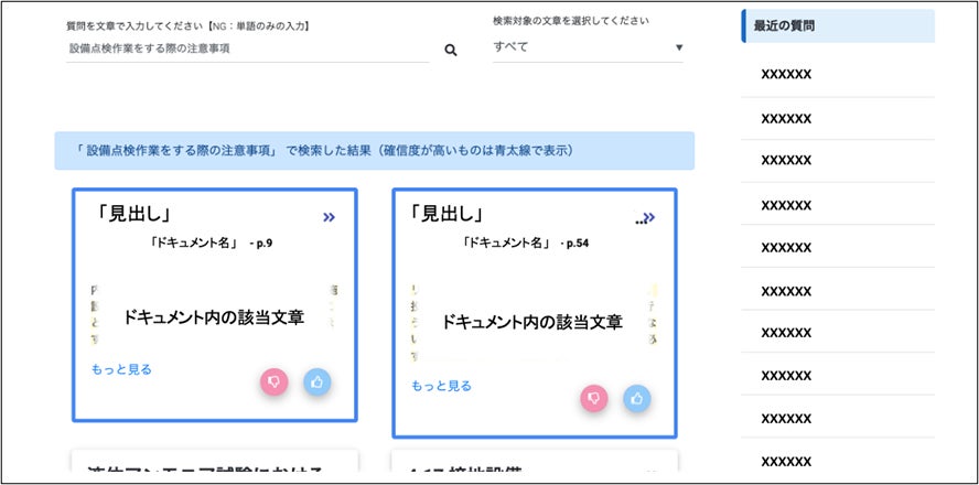 「AMY Knowledge Finder」をENEOSの全製油所および技術系部門を中心とする本社の一部部門へ導入したことで、AIが入力した自然文から検索意図を理解し、適切な回答を検索・提案が表示されるため、誰でも簡単かつ短時間で情報収集ができるようになりました。また、AIが特に確信を持っている回答には色付けして優先表示されるなど、視覚的に分かりやすく表示されるため、ユーザーが直観的に効率よく目的の情報を入手することができるようになりました。これにより、適確な情報を自分で収集することができ、情報格差の解消や、社内に蓄積されたノウハウなどの技術伝承の促進効果が期待できます。