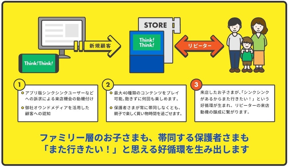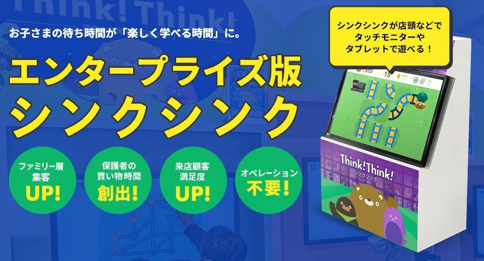 本サービスのベースとなっている知育アプリ「シンクシンク」は、その教育的効果が既に実証されており、保護者の方は安心してお子さまを遊ばせることができます。家族のお買い物時間や待ち時間が「学びの時間」になることで、お客さまの満足度向上にもつながります。
