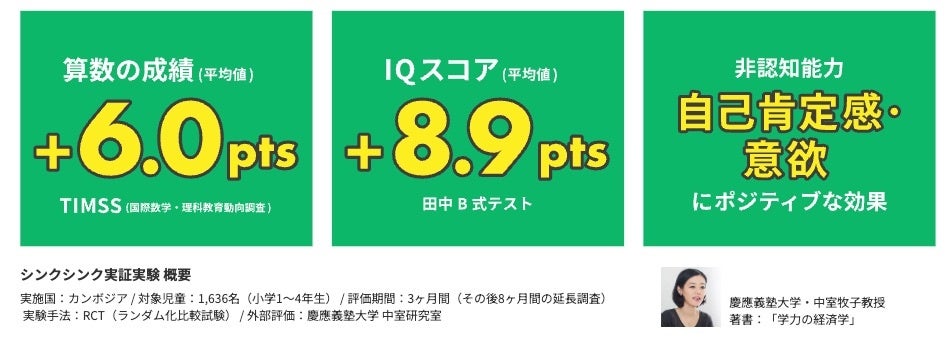 また、カンボジアにて、同国政府の全面協力のもと、国際協力機構(JICA)、慶應義塾大学中室牧子研究室と行った実証実験では、シンクシンクが学力・IQに有意な効果を及ぼすことが確認されています。(*2)(*3)
