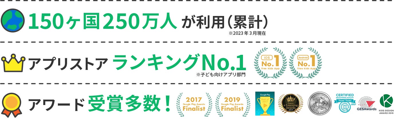 Googleによるアプリアワードの受賞、キッズデザイン賞の受賞など、国内外で高い評価を受けており、言語の壁を超え世界150か国の子どもたちに愛されています。