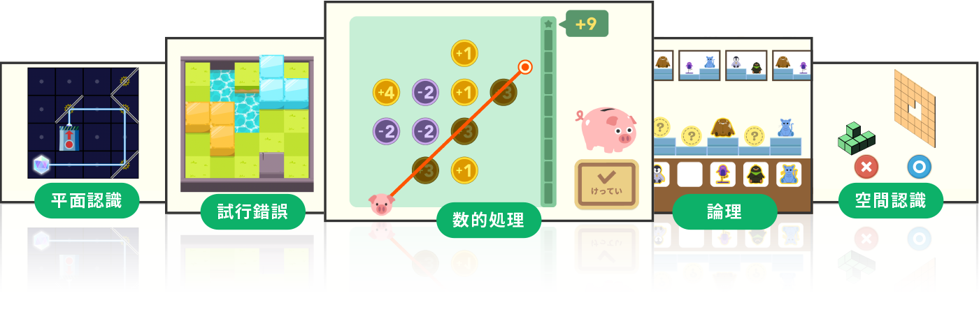 本サービスは、思考力が育つ土台となる5分野(空間認知・平面認知・試行錯誤・論理・数的処理)を網羅的に楽しみながら学べる知育アプリ「シンクシンク」の中から、お子さまに大人気の問題を厳選して収録しています。