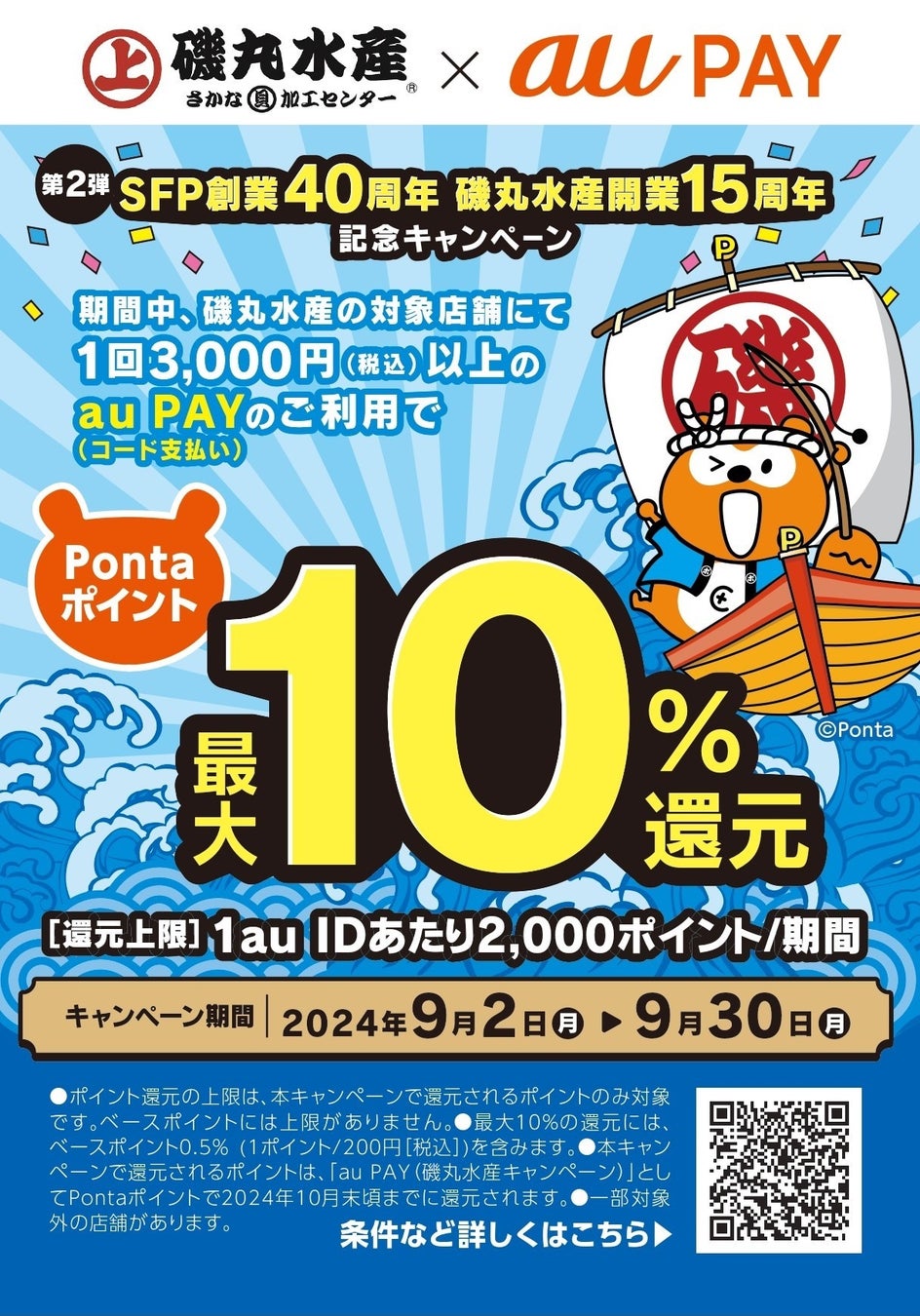 キャンペーン名:SFP創業40周年・磯丸水産開業15周年記念【au PAY】Ponta ポイント最大10%還元キャンペーン