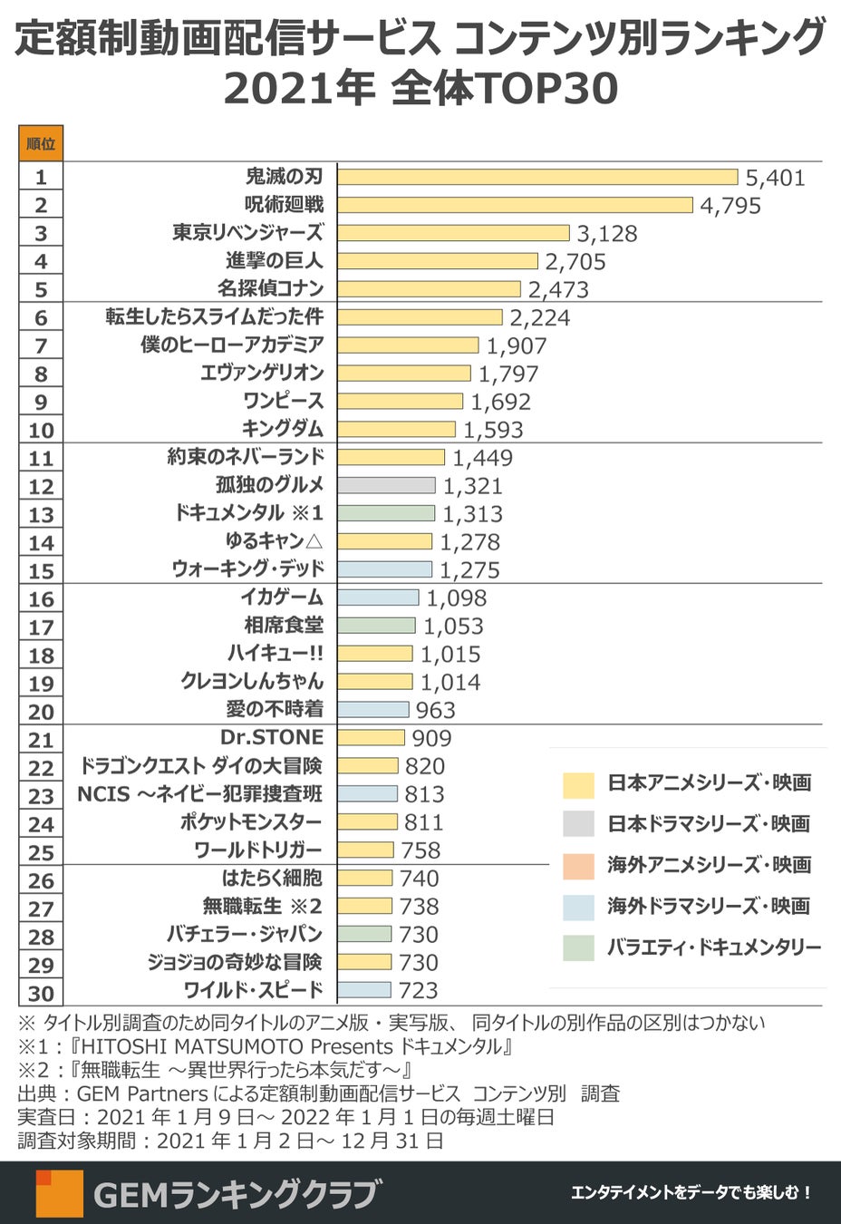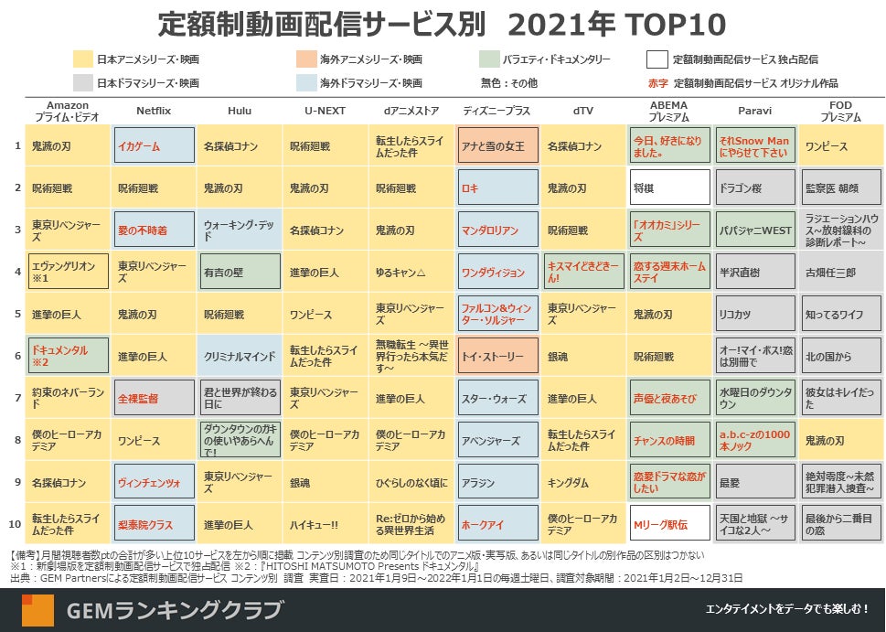 <2021年 定額制動画配信サービス 視聴ランキング総括>アニメ強し、年間TOP10を独占、各社のオリジナル・独占作品、ラインナップ戦略に特色