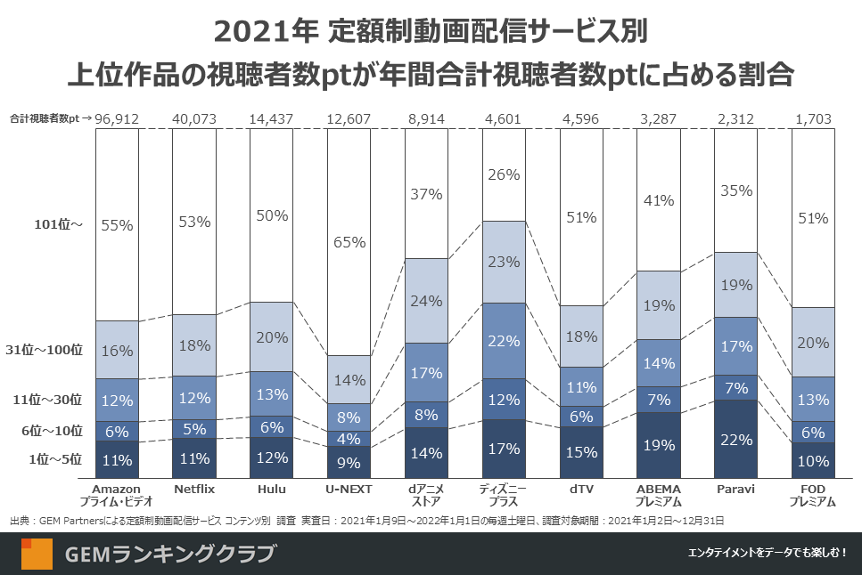 一方、コンテンツ数がほかのサービスよりも圧倒的に多いU-NEXTの場合、上位30位までの視聴者数ptは21%です。上位作品が全体視聴者数ptの合計に占める割合が低く、コンテンツ数の多さに裏打ちされた「より多くの作品が視聴されている」状況となっています。