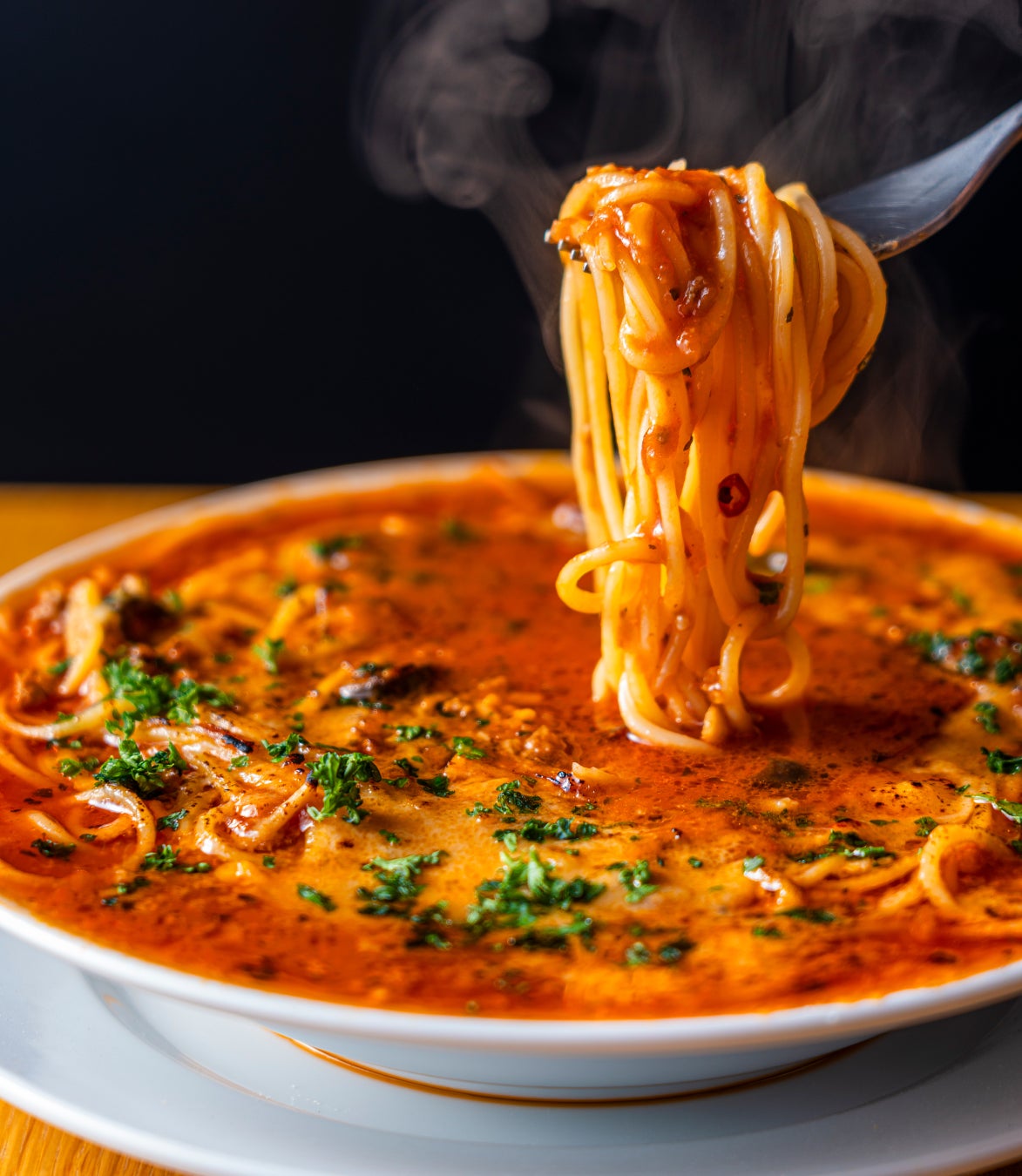 旨みが凝縮した濃厚トマトクソースに、にんにくの香りが立ち上るスープパスタ。
