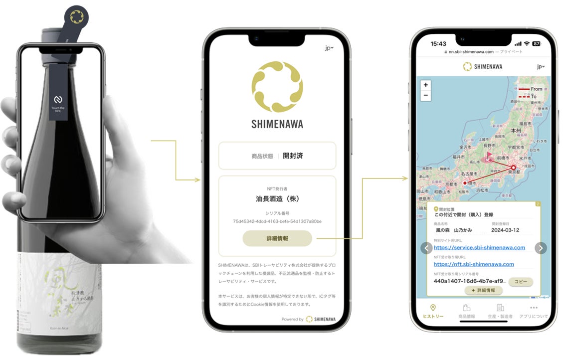 日本酒を購入し、開封した後にスマートフォンでNFCタグにタッチすると、「SHIMENAWA(しめなわ)」では