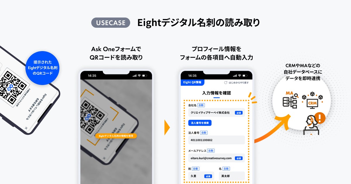 「顧客の声を機会に変える」をミッションに、あらゆる顧客接点で営業機会を逃さないマルチチャネルフォーム「Ask One」を提供するクリエイティブサーベイ株式会社(以下クリエイティブサーベイ)は、Sansan株式会社が提供する名刺アプリ「Eight」と連携し、QRコードから名刺情報を読み取ることができる機能を搭載したことを発表します。今後、Eightログインによる名刺情報連携やEight Team連携も予定しております。