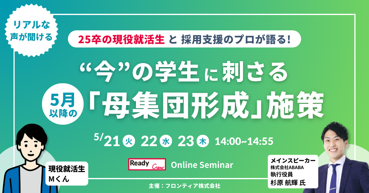 このような声にお答えすべく、当社マーケティング部のサポート業務を行う現役大学生による登壇のもと、新卒ダイレクトリクルーティングサービスのABABAを運営する、株式会社ABABA 執行役員の杉原 航輝氏をゲストに招き、母集団形成に課題を感じる中小企業に向けた適切な施策についてお話しいたします。