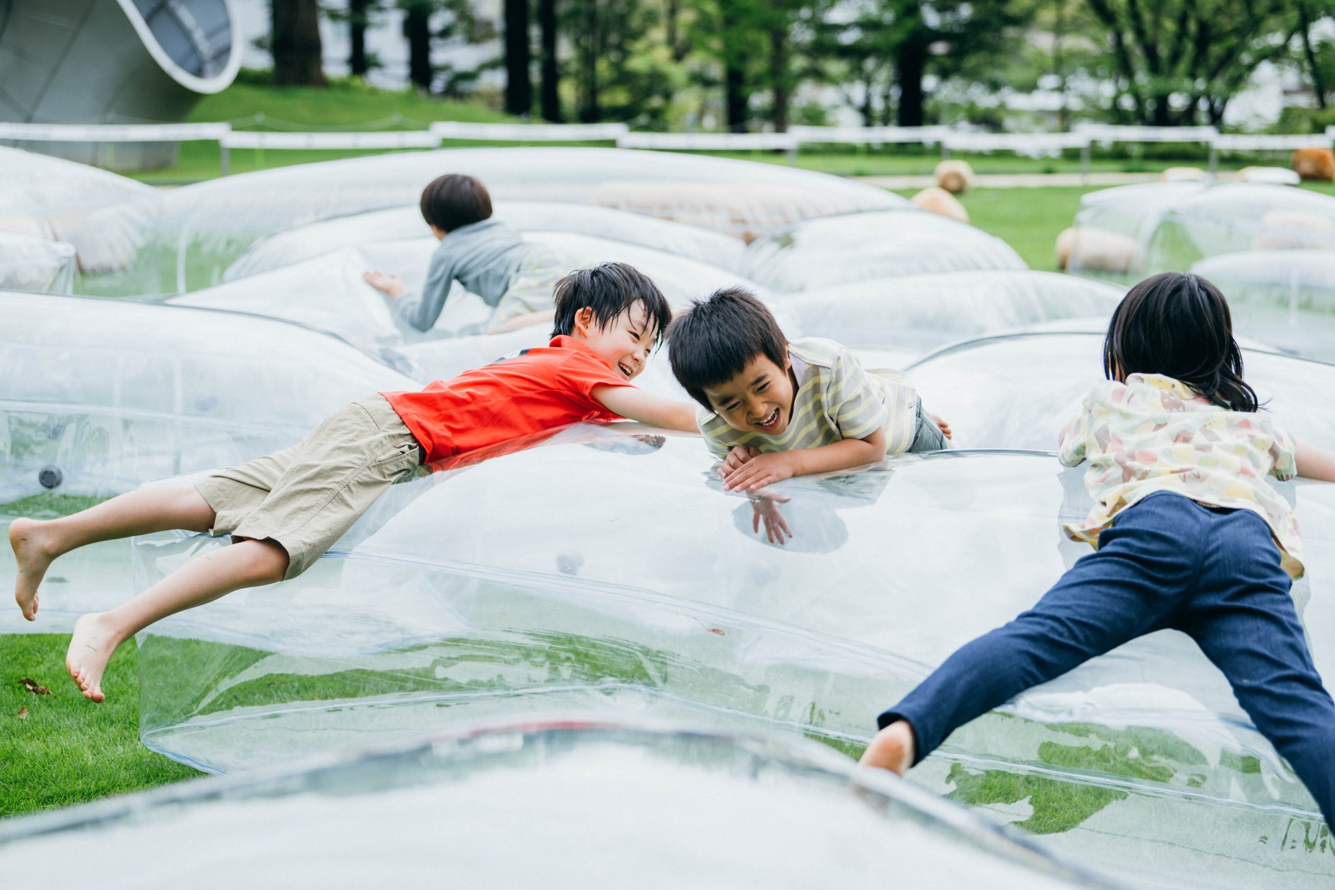 空気が詰まった、形も大きさも硬さも様々な透明なビニールたち。透明で空っぽですが、空に浮かぶ雲のようでもあります。座ったり、押したり、間に分け入ったり、遊び方は自由。疲れたら寝転がって空を眺めるのも楽しそうな遊具を展開します。