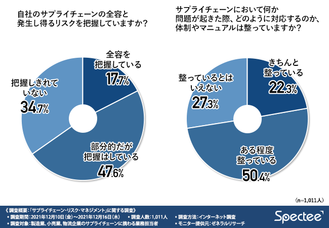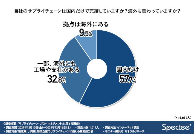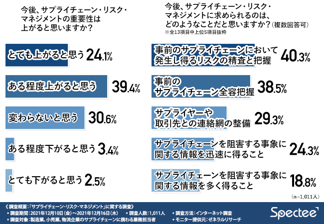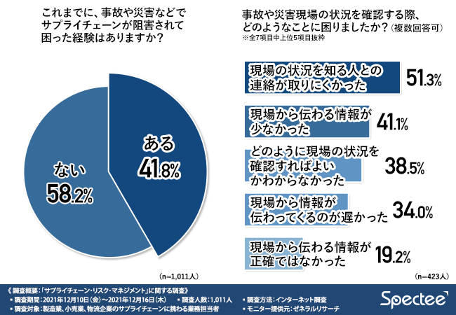 そこで今回、AI防災・危機管理ソリューション『spectee Pro(スペクティープロ)』(https://spectee.co.jp/service/spectee/)を手掛ける株式会社Spectee(スペクティ)は、製造業、小売業、物流企業のサプライチェーンに関わる業務の担当者を対象に、「サプライチェーン・リスク・マネジメント」に関する調査を実施しました。