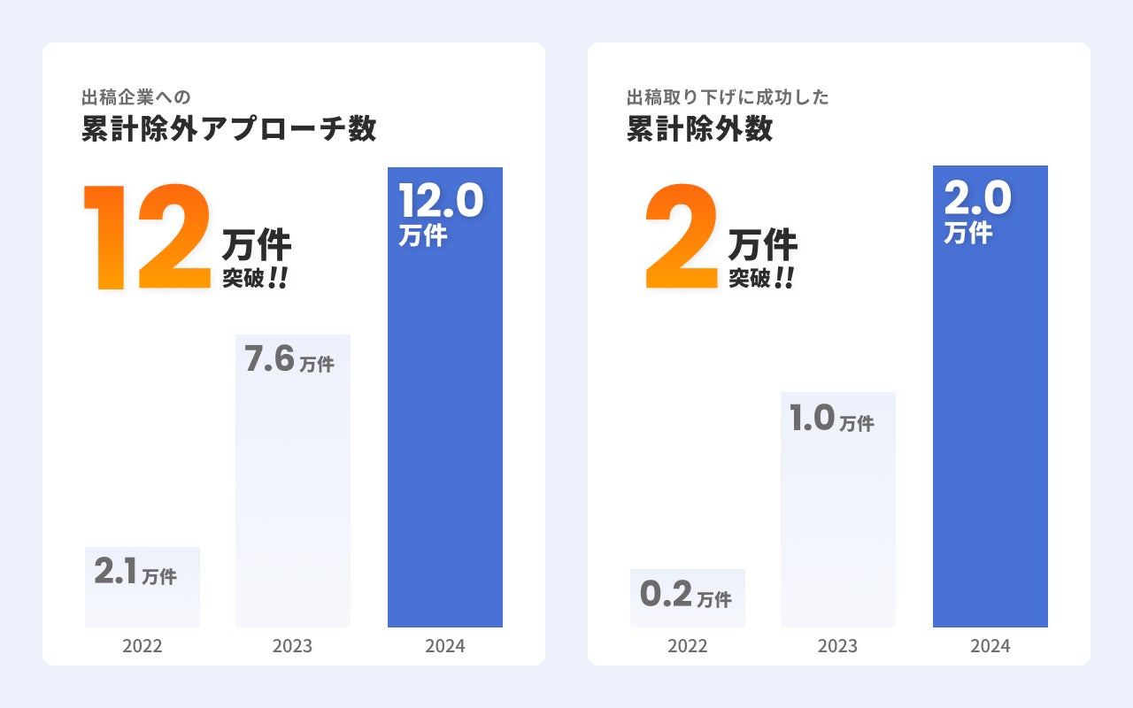 2022年2月に提供開始した競合出稿・ブランド毀損の対策サービス「ISSEKI」は、2024年10月31日時点で不正出稿に対する累計除外アプローチ数が12万件(※1)、累計除外数が2万件(※2)を突破いたしました。