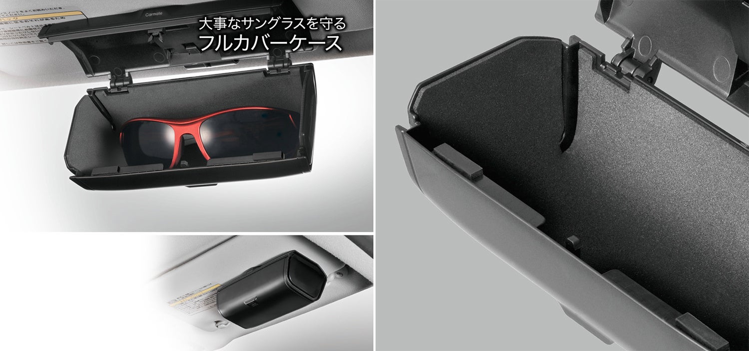 サングラスは厚みのあるスポーツタイプやレンズが大きいタイプも収納可能。ツルを閉じた状態で高さ51mm幅160mm厚み70mmまで収納。内側にはインナークッションが付いており、カタカタ音を防止してサングラスやメガネを保護します。