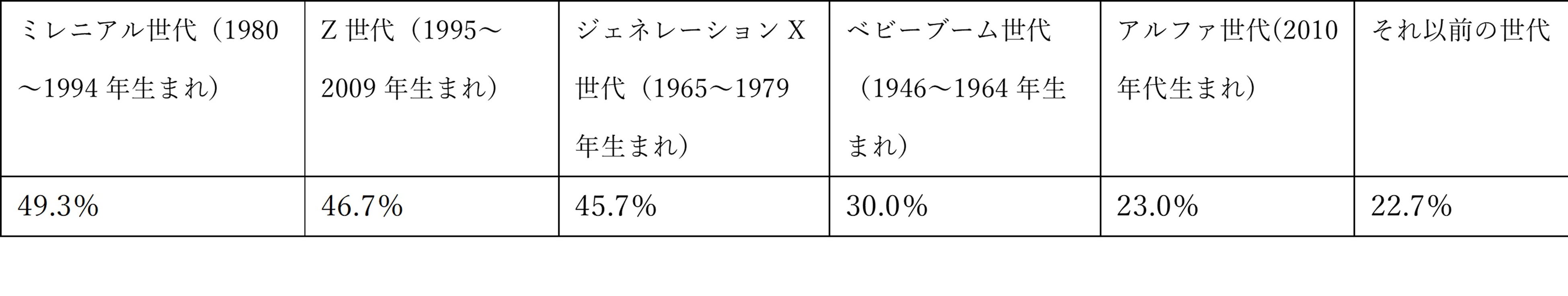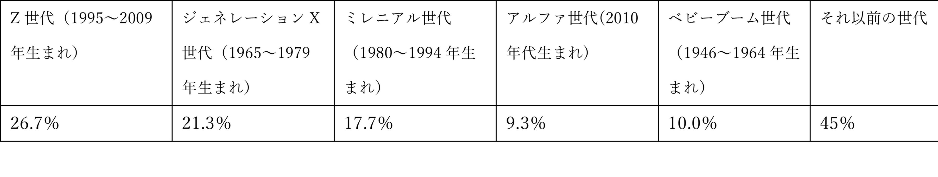 ミレニアル世代(1980~1994年生まれ)、Z世代(1995~2009年生まれ)、アルファ世代(2010年代生まれ)