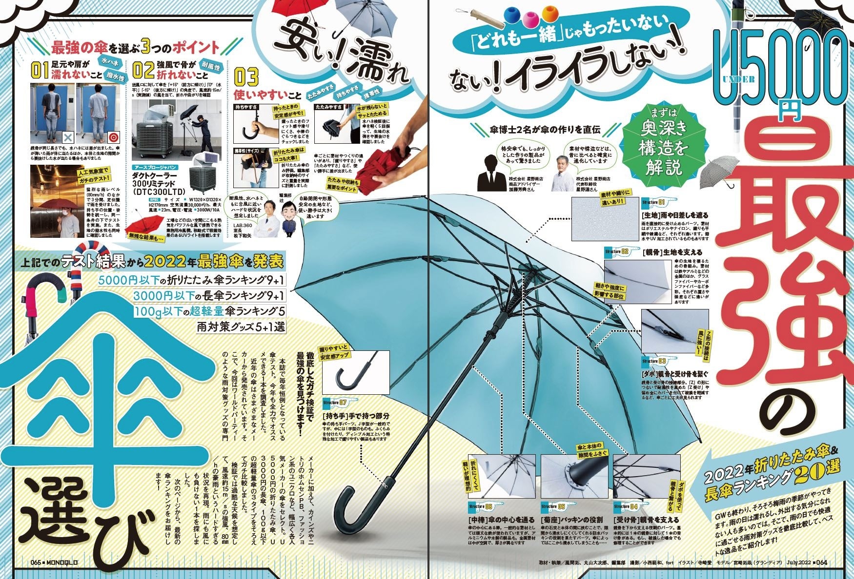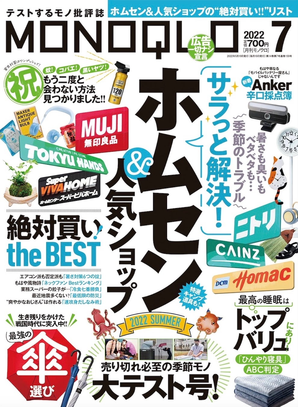7月号は、暑さ・臭い・ベタベタなど季節のトラブルをサラッと解決してくれる「ホムセン&人気ショップ 指名買いTHE BEST 2022 SUMMER」を大特集! ベタついた頭皮と髪の毛をリフレッシュするクールシャンプー、汗も臭いも抑えてくれる制汗剤など、ホームセンターや人気ショップで買える季節対策グッズをご紹介。ほかにも、5000円以下で買える最強の折りたたみ傘&長傘ランキング20選や、コバエや蚊を撃退する害虫対策アイテムなど、今欲しい情報満載でお届けしています。本リリースでは、編集部が“本当におすすめできる”製品の⼀部をご紹介します。