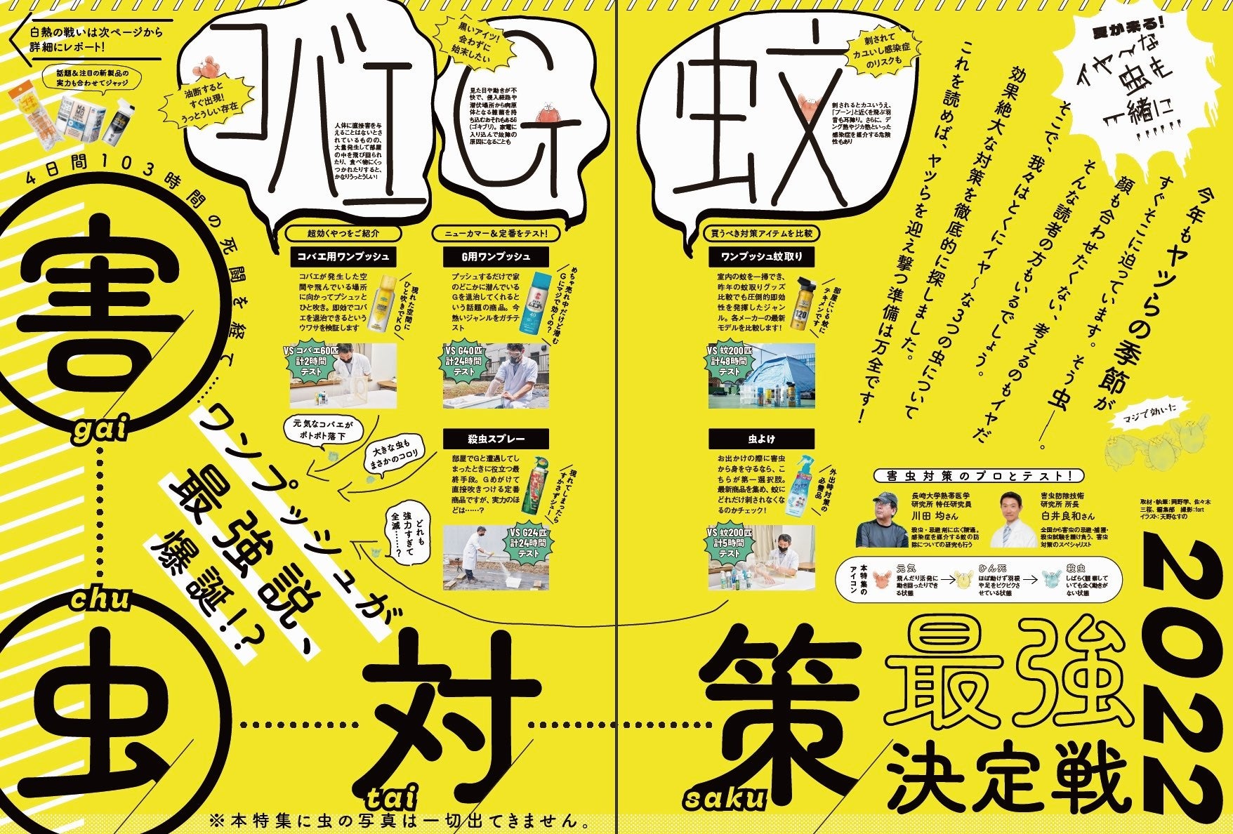 今年もイヤ〜な害虫の季節が迫っています。刺されてカユいし羽音も気になる「蚊」、見た目や動きが不快な「G」、大量発生する「コバエ」など、気になる害虫を撃退してくれる対策アイテムをプロと一緒にテストしました。