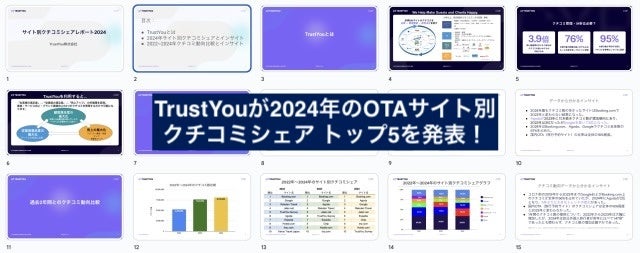 今回は、TrustYouのクチコミデータベースを用いて、2024年のサイト別クチコミシェアランキングとインサイトと2022年〜2024年のクチコミ動向比較をまとめた資料を公開しました。日本国内の宿泊施設に関するクチコミレビューがどのOTAサイト(旅行予約サイト)にどの位集まっているのかを調査。その割合(シェア)をグラフにまとめ、インサイトと共にレポートとしてまとめました。