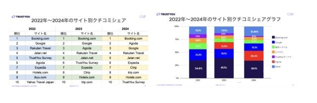 過去のクチコミシェアをみてみると、コロナ前の2019年から2023年まで、Booking.comとGoogleがクチコミ全体の56%を占めていましたが、2024年はAgodaが2位となったことで5年ぶりに大きなトレンドの変化がありました。