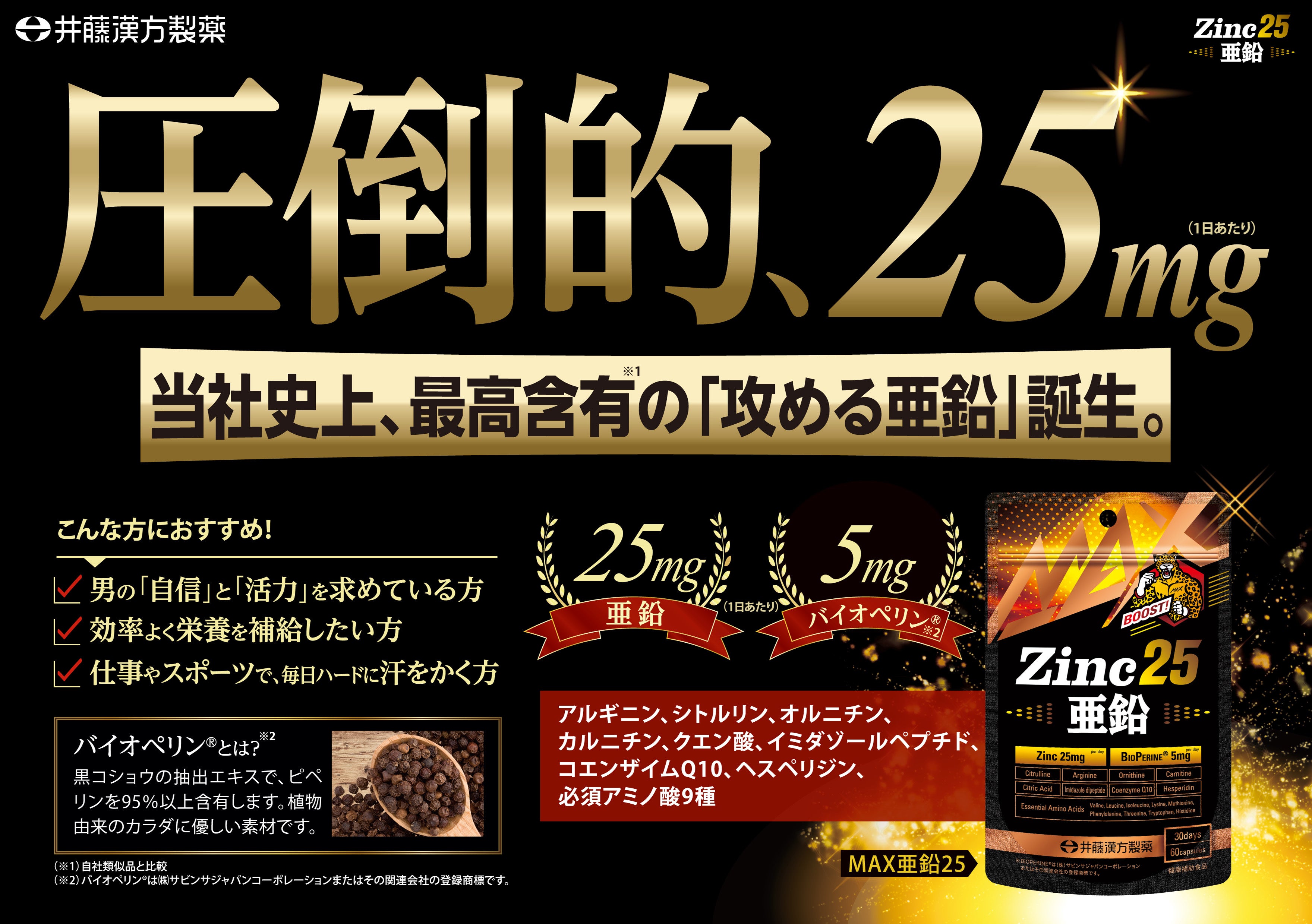 1日2粒で亜鉛25mg!植物由来の黒胡椒抽出物「バイオペリン®※」配合で、活力ある毎日を強力サポート【MAX亜鉛25】新発売