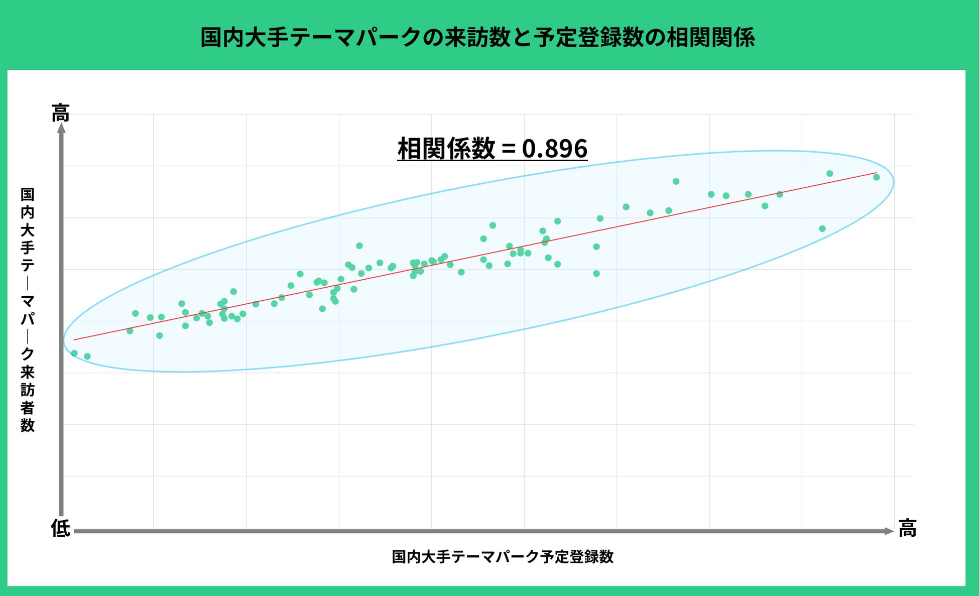 「TimeTree Ads」においてドコモDCRを導入し始めるにあたっての初期分析として、TimeTree内で「国内大手テーマパーク」の予定を登録しているユーザーデータと、ドコモ DCR上で同テーマパークの位置情報を持つユーザーデータをそれぞれ日別に集計し分析した結果、「予定数」と「来訪者数」の間には相関係数が「0.896」となる高い相関関係が確認されました。