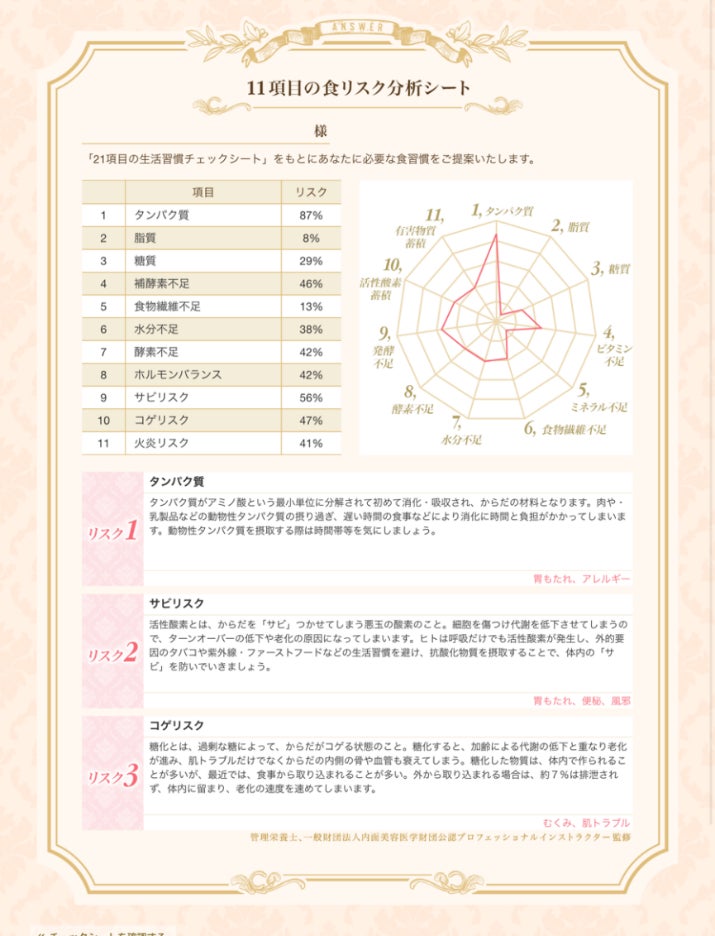 食事をはじめとして、生活・運動習慣、1日のスケジュールなど21項目のチェックシートから、11のリスクを分析いたします。普段の生活では意識しにくいさまざまなリスクがわかる分析です。