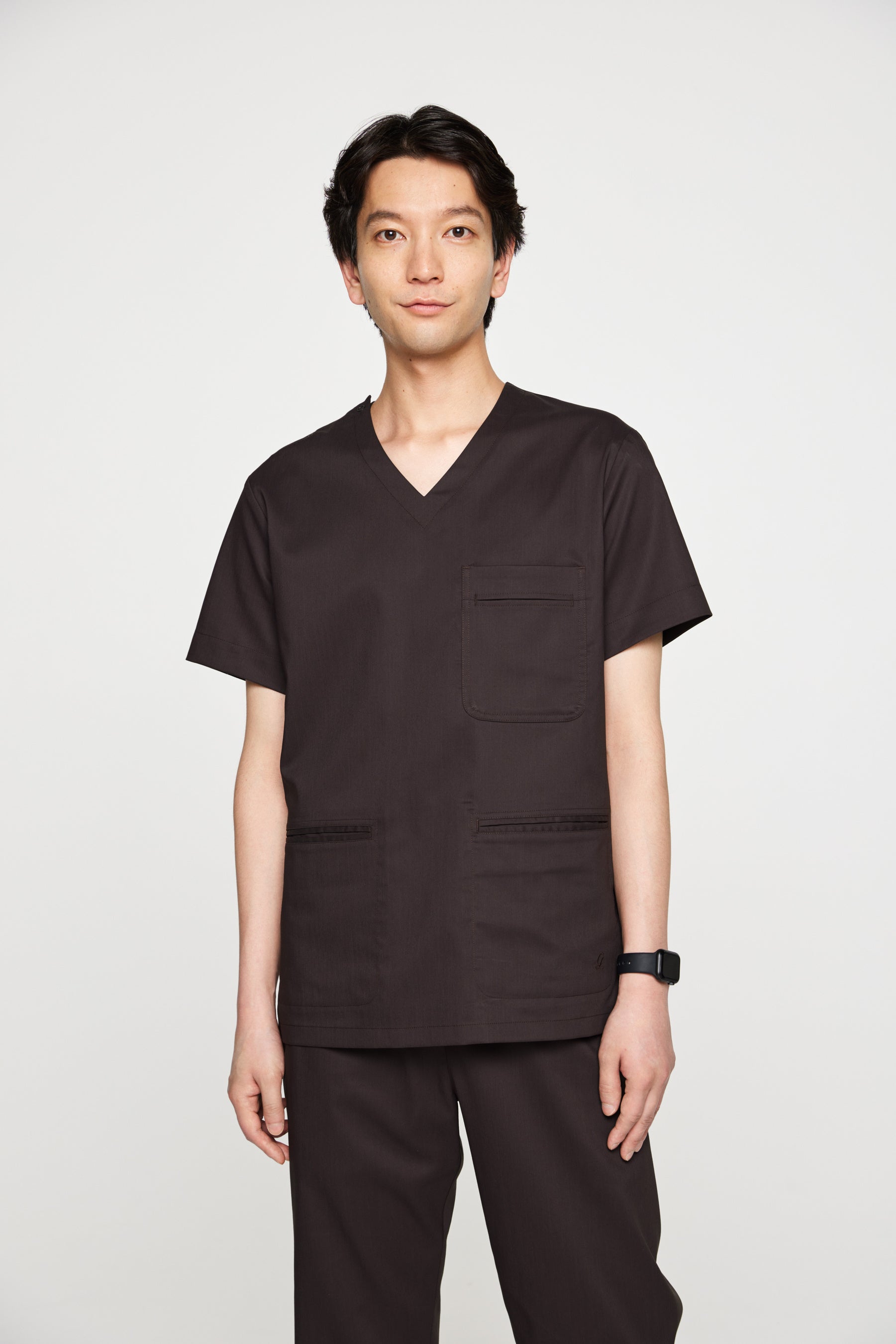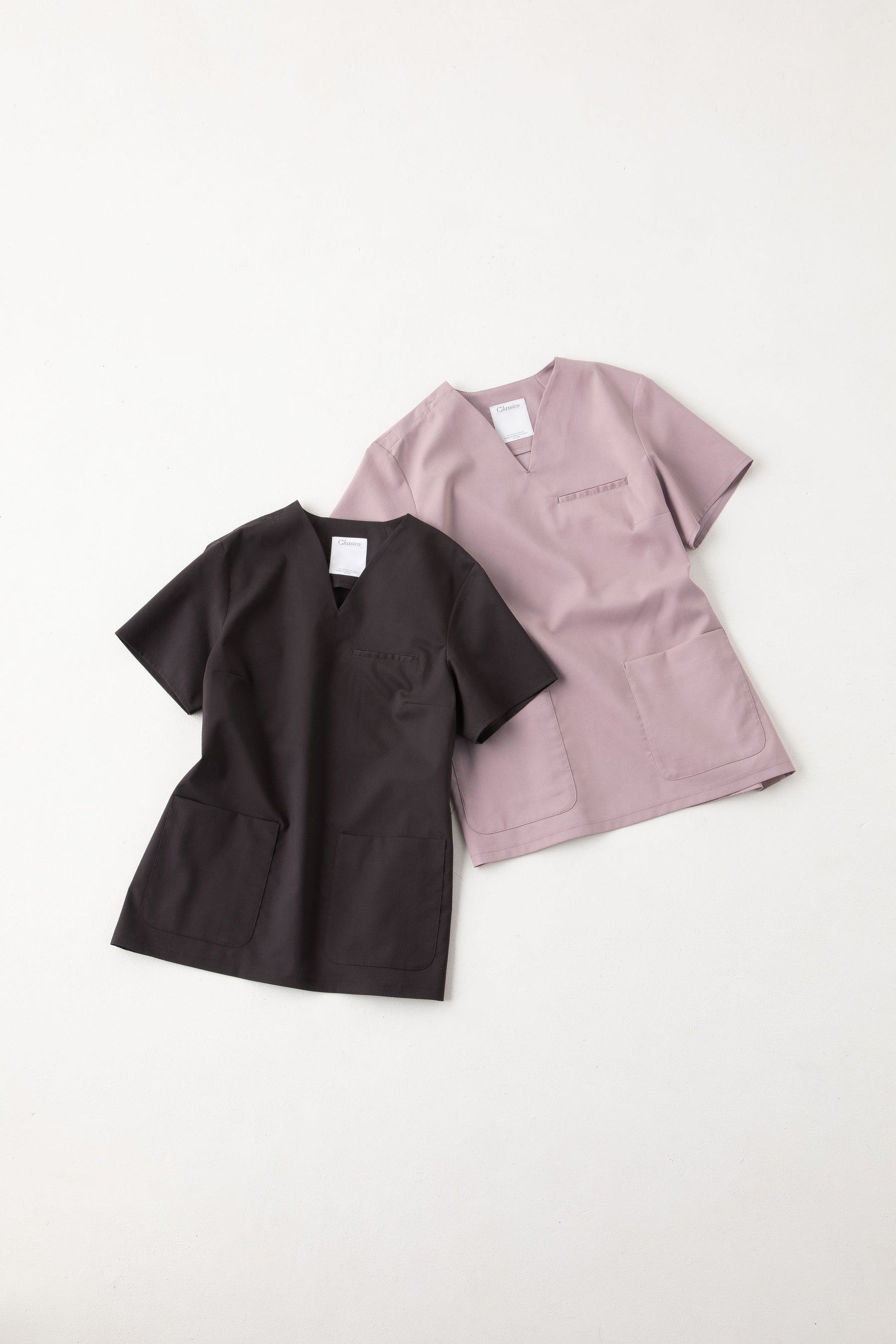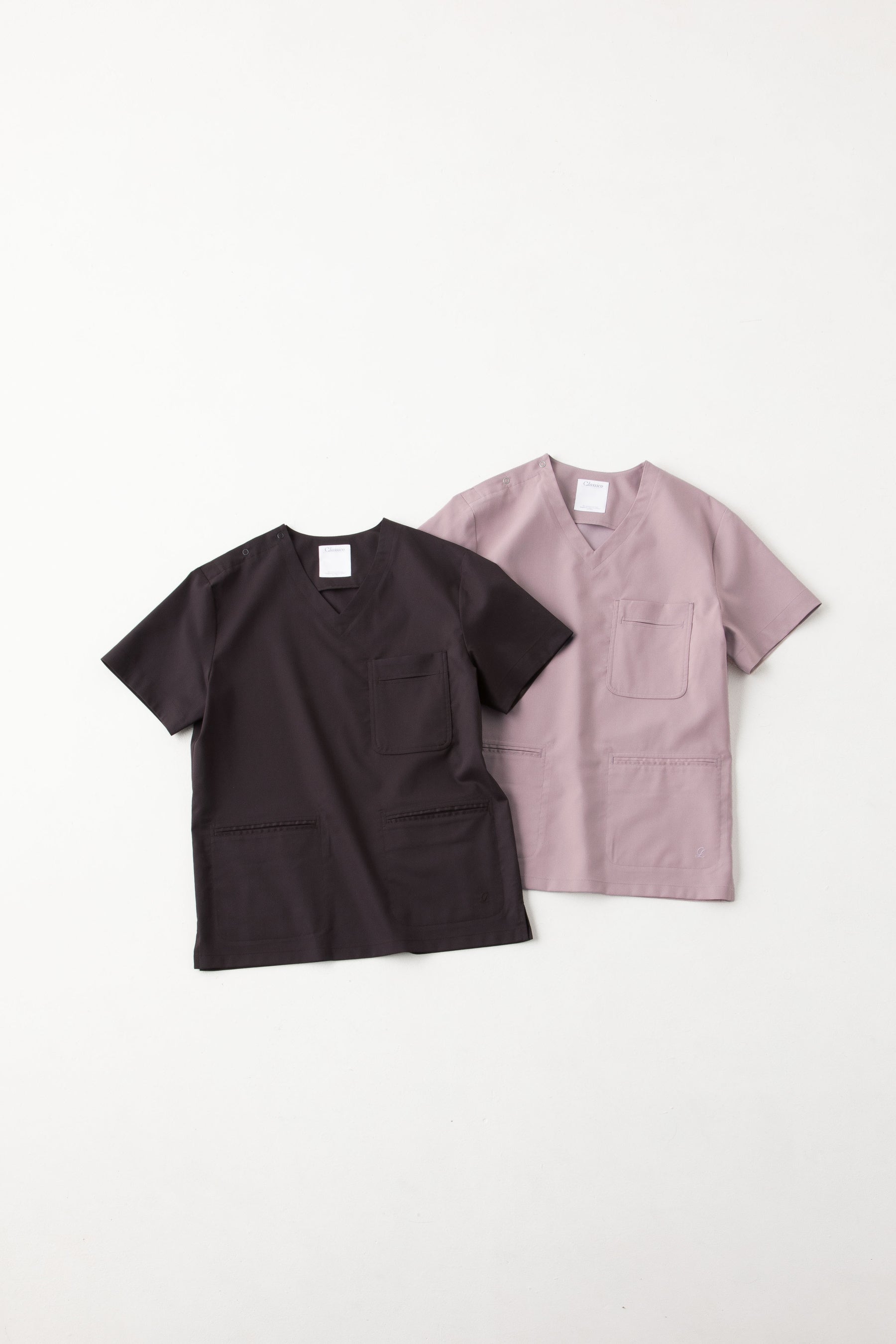 素材は綿とポリエステルの混紡でシワになりにくいうえに軽くハリがあるのが特徴で、体を動かすことが多い医療従事者にもストレスなく長時間着用いただけます。また素材の一部にリサイクル素材を使用し、環境にも配慮しております。カラーはこれまでのディープネイビー、ディープグリーン、チャコールグレー、プラムに加えて新色としてピンクとダークブラウンが登場し、発色の美しい全6色のカラー展開となります。ぜひご自身にあったカラーを選んだりチーム内で揃えたり、お好みに合わせて選んでいただければと思っております。