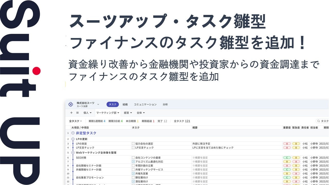 株式会社スーツ(所在地:東京都千代田区、代表取締役社長CEO:小松 裕介)は、チームでかんたん、毎日続けられるプロジェクト・タスク管理ツールの経営支援クラウド「Suit UP」(スーツアップ)にファイナンスのタスク雛型を追加したことをお知らせします。