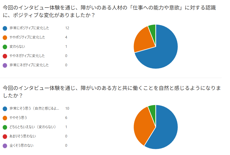 実証に参加した社員17名中16名が、障害者人材の「仕事への能力・意欲」への認識がポジティブに変化。全員が「障害者人材と共に働きたい」と回答しました(「非常にそう思う」10名、「ややそう思う」6名)。