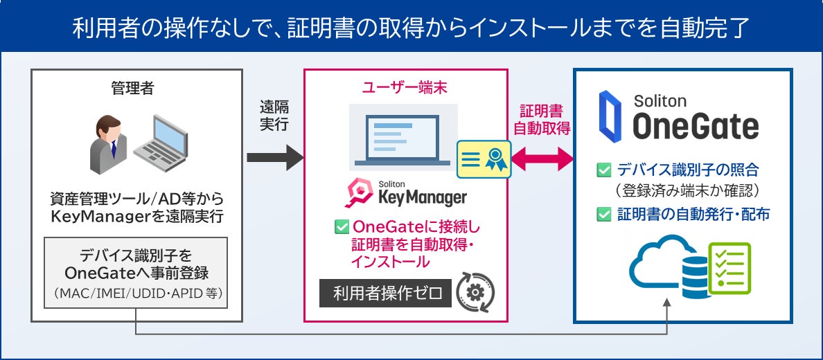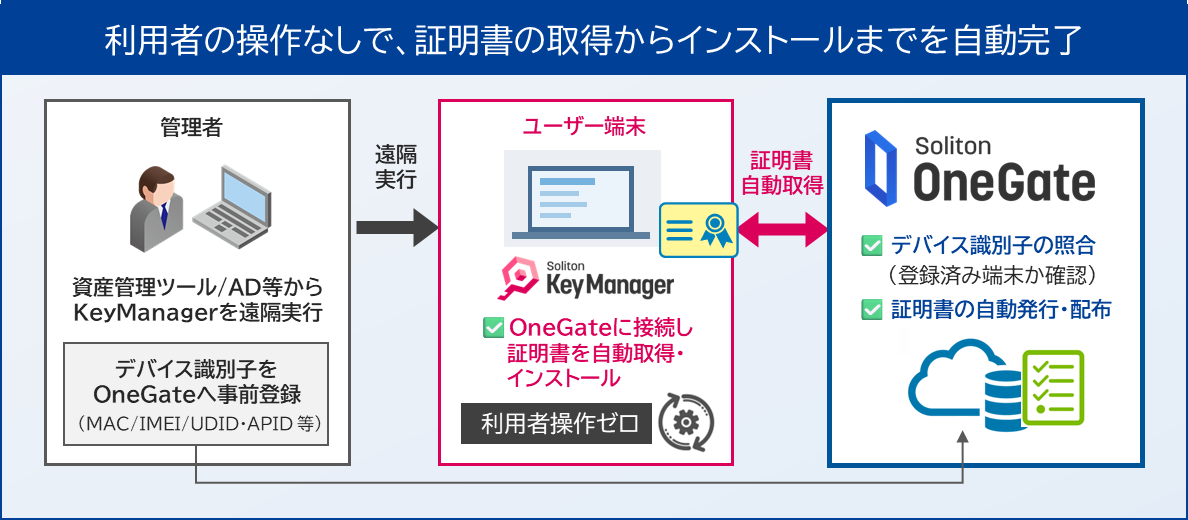 IT資産管理ツールやActive Directoryのグループポリシーから遠隔実行することで、利用者の操作なしにクライアント証明書の取得・インストールが可能です。あらかじめ証明書管理アプリ「Soliton KeyManager」を端末へ展開しておくことで、証明書の取得処理を自動化できます。OneGate側では、事前に登録した端末識別情報(MACアドレス、IMEI、UDID、APIDなど)と照合して配布対象を管理し、対象外端末への誤配布を防ぎます。