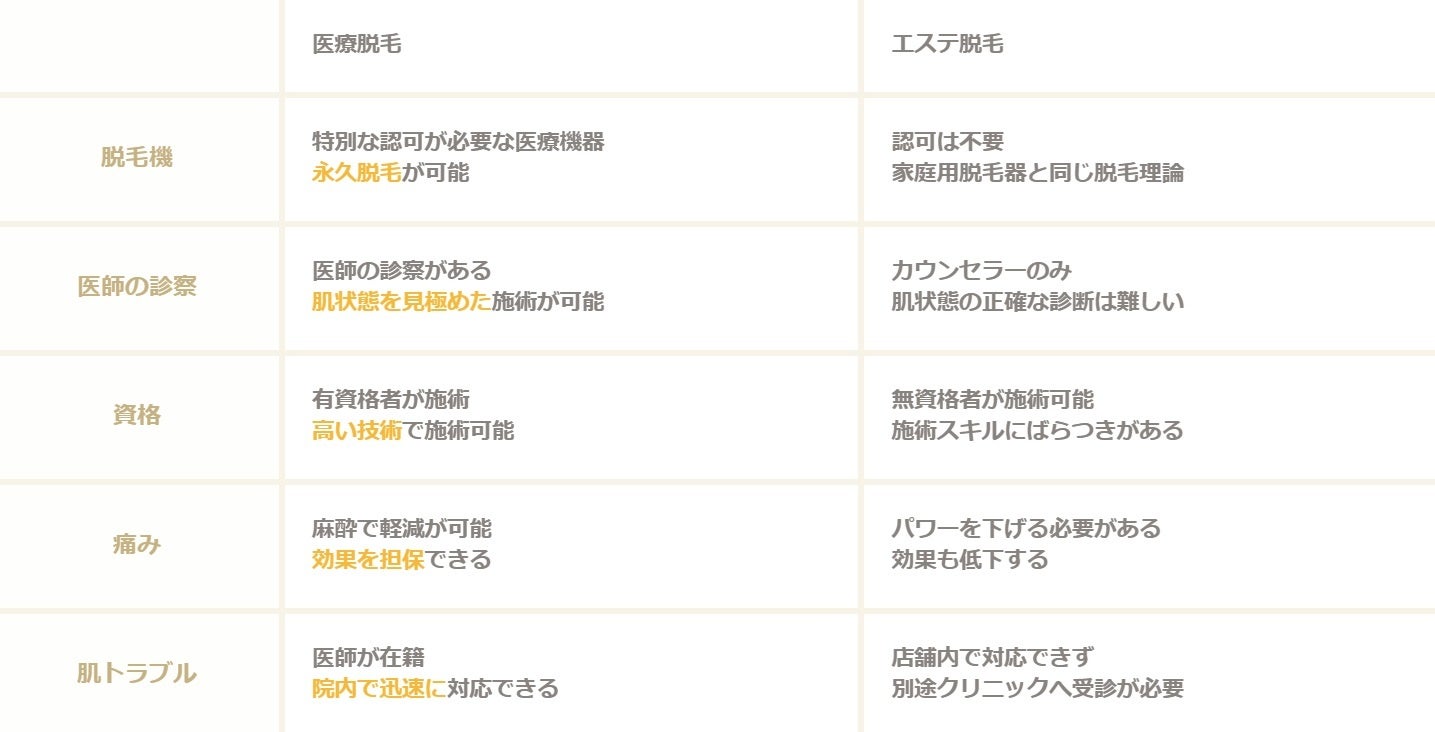参考:医療機関(クリニック)での「医療レーザー脱毛」と、「エステ脱毛(美容脱毛)」はまったく違います