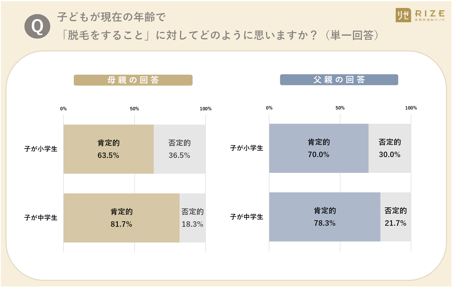 【子どもが現在の年齢で「脱毛」することをどう思う?】の問いには、子が「小学生」の場合、母親の6割、父親の7割(母親63.5 %、父親70.0 %)、子が「中学生」の場合だと、父母ともに約8割(母親:81.7%、父親:78.3%)が【脱毛に肯定的】と回答するなど、親世代の心情が浮き彫りになりました。