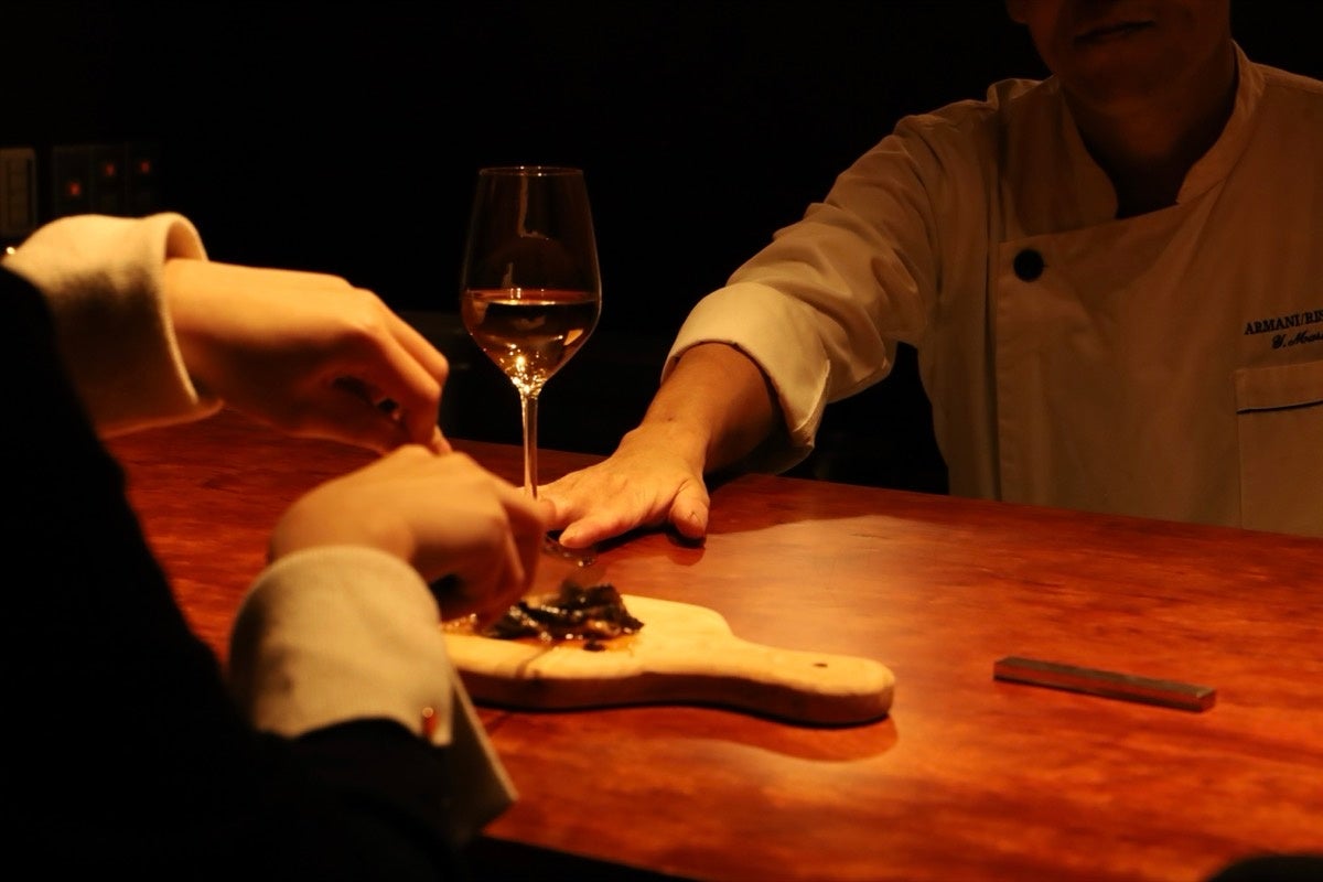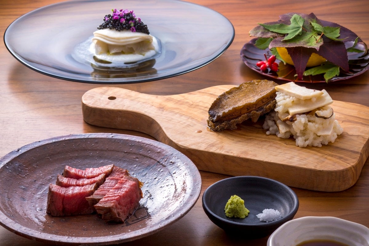 雲丹、鮑、トリュフ、牛フィレ肉といった⾼級食材をふんだんに使い、季節の味覚を巧みに取り入れた、遊び心あふれる独創的なスタイルのお料理を提供します。丹後の冬の味覚として定評のある「松葉ガニ」の甘みを引き立てるパスタや、本店の「自家製カラスミかけ放題」をそのまま再現した冷製パスタ、丹後半島産の塩を添えていただく約40日間熟成した牛フィレ肉など、本店で人気のあるメニューを取り揃えます。山口シェフ自らセレクトしたお料理にあうワインだけでなく、丹後は酒蔵が豊富なことから、イタリアンと日本酒のペアリングも提供いたします。