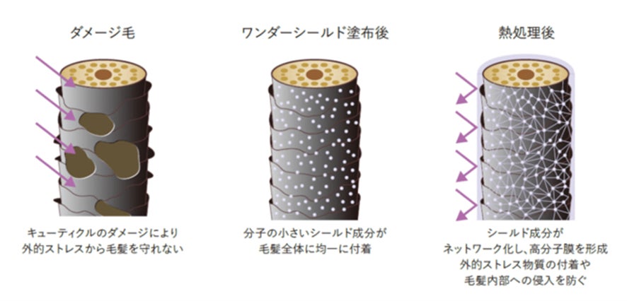ワンダーシールドは、ドライヤーの前にさっとひと吹きするだけで独自の薄く強いシールド膜が髪に密着。熱を加えることにより、シールド成分をネットワーク化。毛髪表面を持続性の高い高分子膜でくまなく覆います。このメカニズムにより、髪を保護するだけではなく、サロンでのトリートメント効果を閉じ込めることができます。
