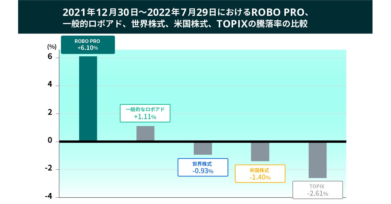 なお、同じ期間で「一般的ロボアドバイザー(ロボアド)」(※2)は+1.11%、日本株式の代表的指標であるTOPIXは−2.61%、世界株式を対象とした株式指数MSCI(円建ベース)(※3)は-0.93%、米国株式(※4)は-1.40%という結果でした。