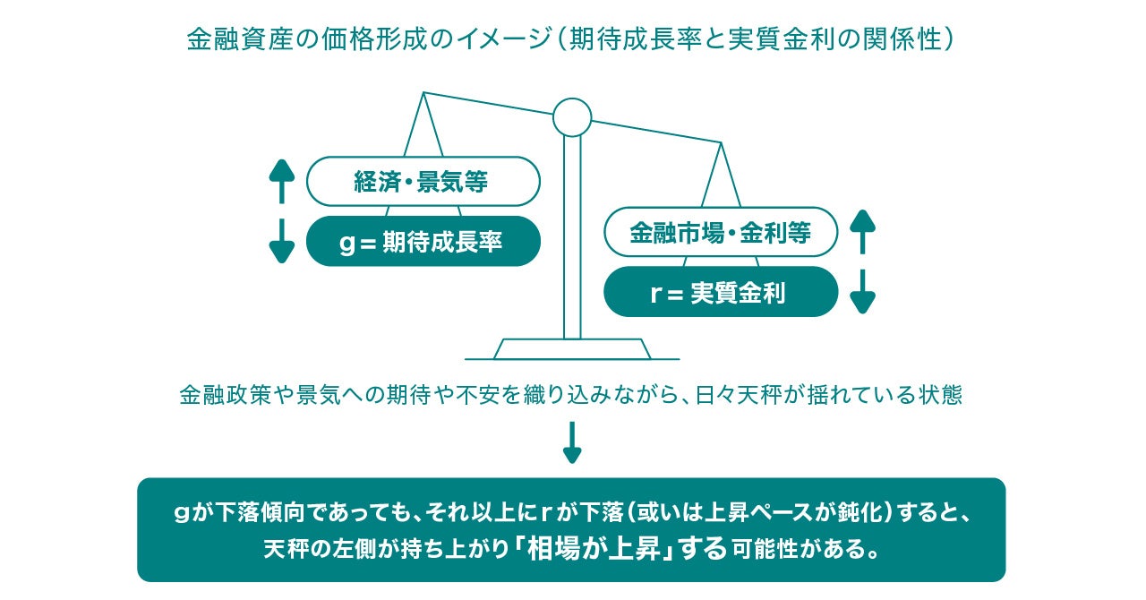 そもそも、金融資産の価格は「経済状況(景気等)」と「金融市場の状況(金利等)」のバランスによって形成されており、そのため、必ずしも「景気後退」が「相場の下落」を招くとは限らず、例えば、米国の利上げペースが市場コンセンサスよりも一層鈍化するとなれば、たとえ景気見通しが悪くても、相場が上向く可能性があります。(下図参照)