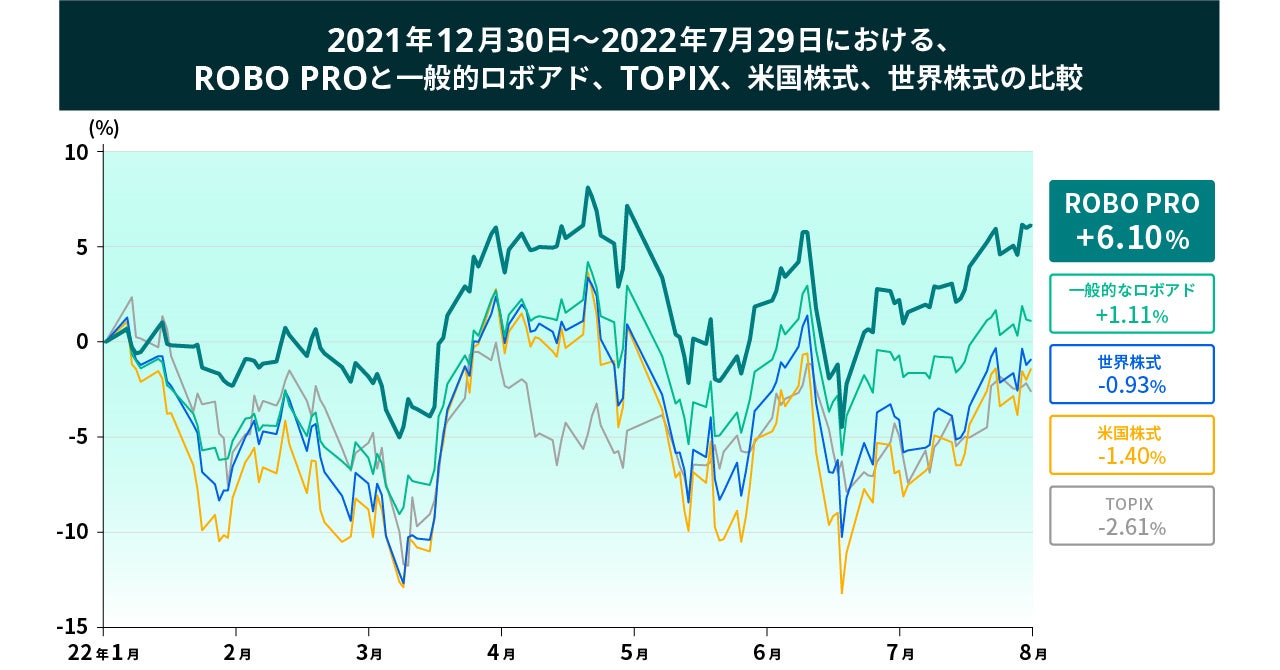 ROBO PROは、この一進一退の株式市場の動向を上手く活かし、相場に合わせて、フレキシブルに資産配分を変えたことにより、2022年初から2022年7月29日の期間において+6.10%のリターンを獲得することができました。