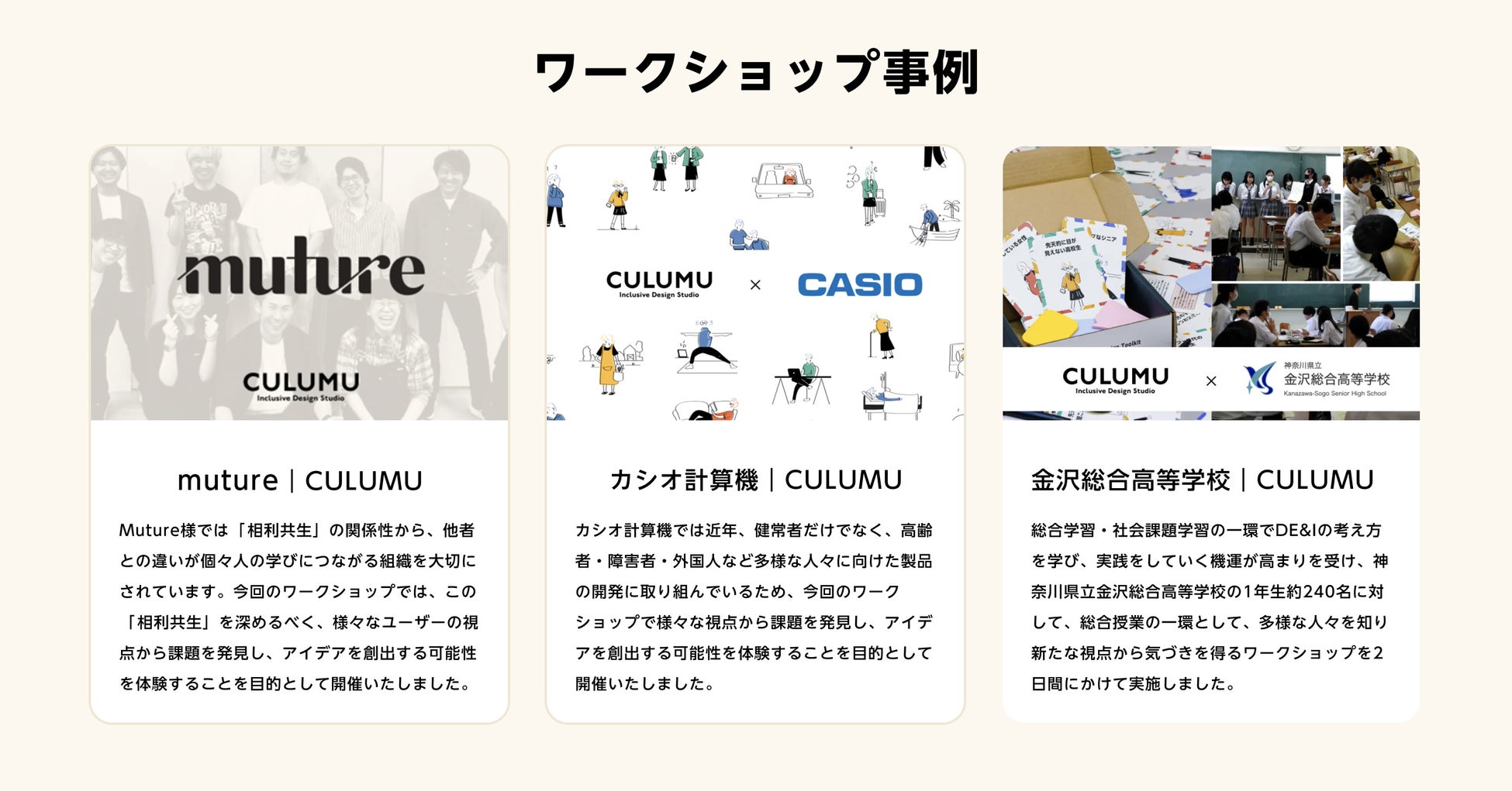 多様な人々・社会と共創する インクルーシブデザインスタジオ CULUMUは、インクルーシブデザイン支援、UXおよびUIデザイン、事業開発の企業支援を行い、高齢者や障がい者、外国人など これからの社会において多様な人々の声を取り入れるユーザー中心のアプローチを体験できる『インクルーシブデザインワークショップ』を提供しております。