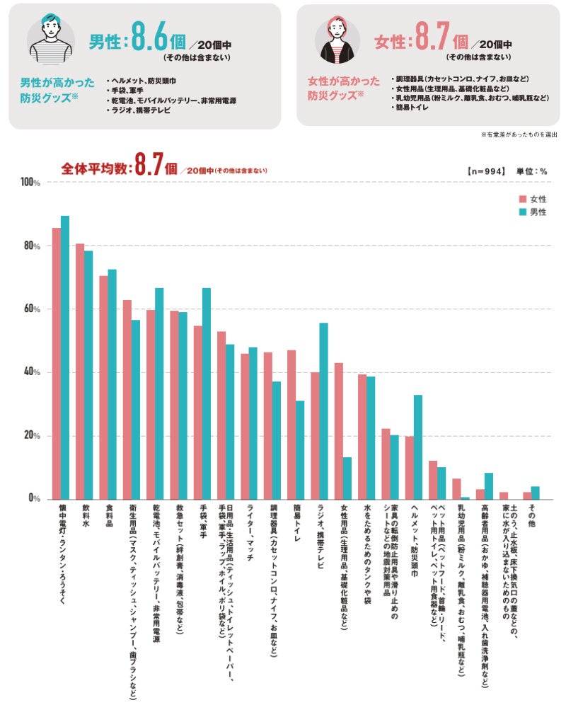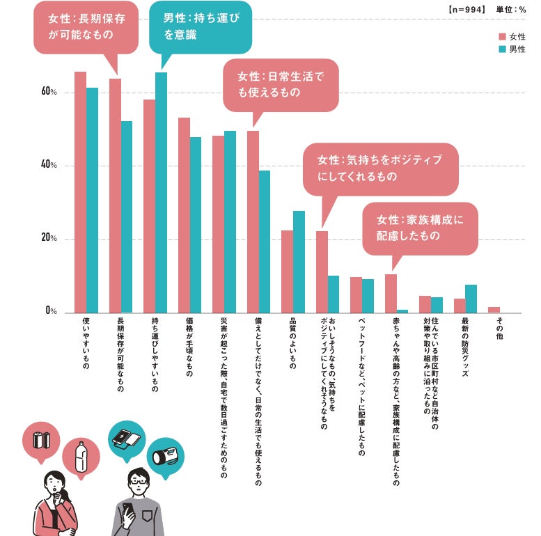 つまり、男性は“モノの機能性”を、女性は“気持ちの安心”を基準に防災準備を行っているのです。